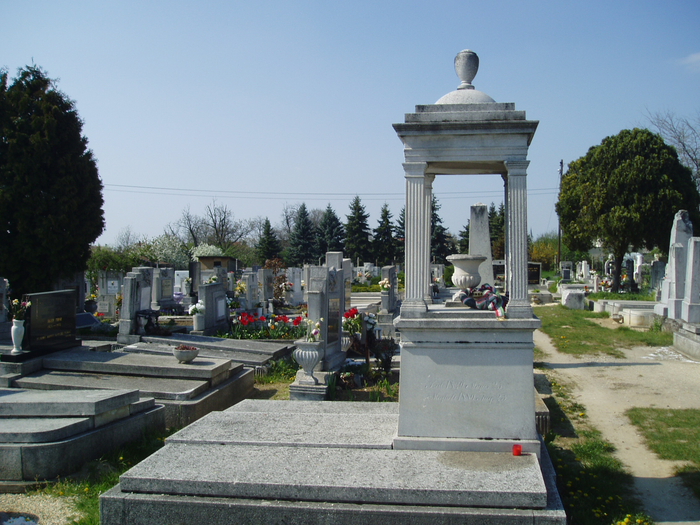 Nyilvános 1379 | 3698 | Pápa, Alsóvárosi temető: Bocsor István sírja | A Jókai utcáról nyíló Temető utca vezet a XIX. század elején megnyílt Alsóvárosi köztemetőbe. A város sok neves személyiségének van itt a sírja. Itt nyugszik Bocsor István (Enying, 1807. okt. 18. – Pápa, 1885. jún. 3.) író, tanár. Enyingi jobbágycsalád sarja. 1819-1832 között Pápán tanult, a református főiskolán teológiai és jogi képesítést nyert, majd 1837-től tanított. Magyar nyelvű történelemórái a város közönségére is nagy hatást gyakoroltak. 1848-ban az enyingi kerület nemzetgyűlési képviselője volt. A szabadságharc bukása után visszavonultan, tanári munkásságának élt. Alakját Kozma Andor: A karthágói harangok c. versében örökítette meg. Latin nyelvtana öt kiadást ért meg. Pápán a Széchenyi u. 10. sz. házon – ahol lakott – emléktáblája, a Dunántúli Ref. Egyházkerület Könyvtárában (Pápa, Március 15. tér 9.) mellszobra van. Radikalizmusáról tanúskodó, előadásait tartalmazó Világtörténelem (1841) című, illetve Középkori történetek (1863–1864.) című kézirata is ebben a gyűjteményben található. A fénykép 2007 áprilisában készült. Felh. irod.: Németh Adél - Szabó Lajos: Pápa. Bp. Panoráma, 1989 Veszprém megyei életrajzi lexikon. Veszprém, Veszprém Megyei Önkormányzat Közgyűlése, 1998 |