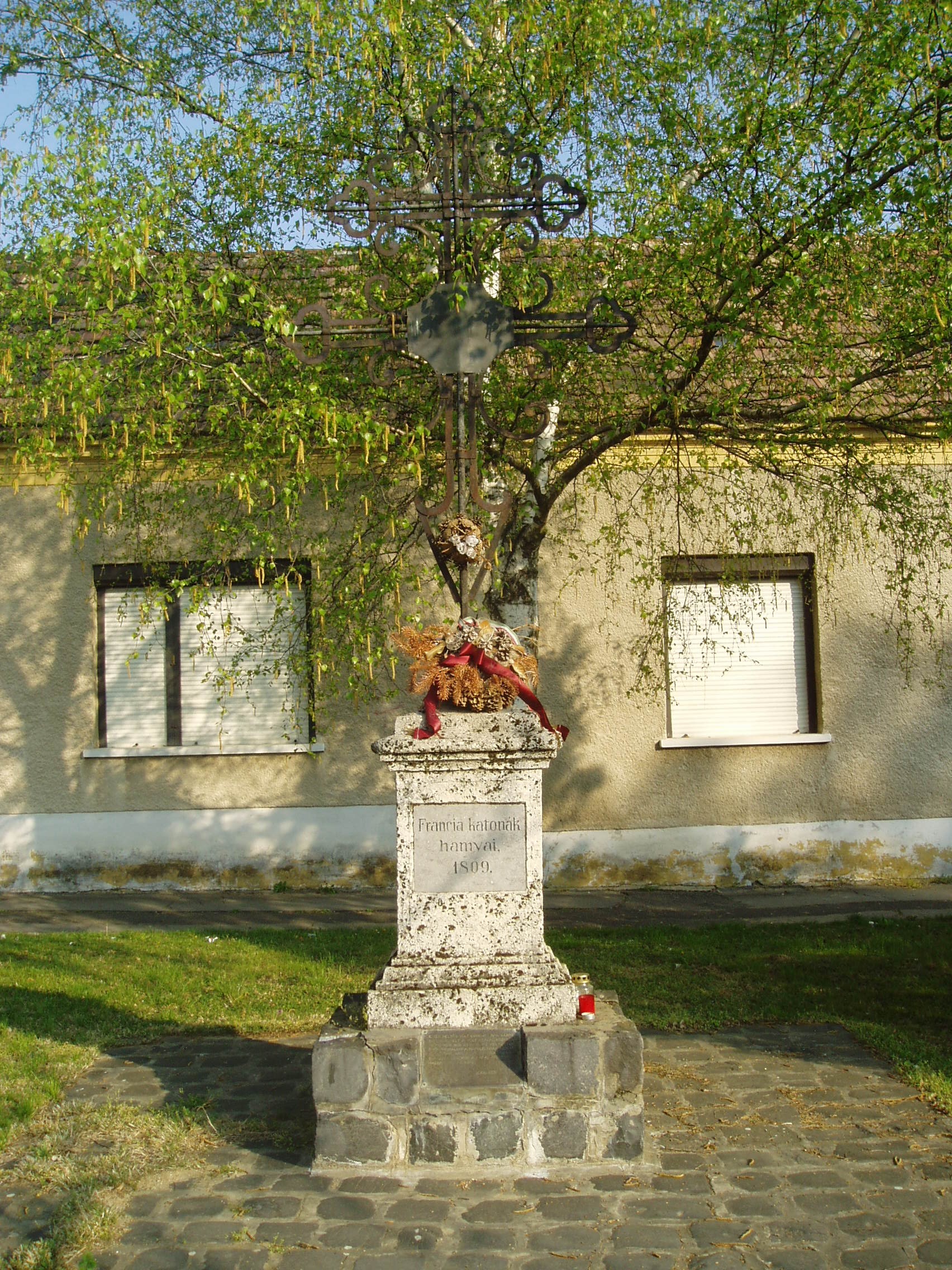 Nyilvános 1128 | 2056 | Pápa, Anna tér: Francia kereszt | Az Anna tér az egykori Alsóváros településközpontja. A tér dombján álló Szent Anna kápolna 1875-ben épült. A közelében található ún. Francia kereszt a napóleoni háború francia halottainak egykori tömegsírja felett áll. Pápát 1809. június 1. és július 6. között megszállva tartották a franciák. A hátrahagyott, majd később idehozott sebesültek ápolásáról a városnak és a megyének kellett gondoskodni. Egyes források szerint több, mint 5000 sebesültet ápoltak a városban, akik közül sokan belehaltak sérüléseikbe. Őket itt, az Anna téren temették el. Hamvaik a temető felszámolása után az Alsóvárosi temetőbe kerültek a kettős vaskereszttel együtt, amelyet 1986-ban állítottak vissza eredeti helyére. A fénykép 2007 áprilisában készült. Felh. irod.: Németh Adél - Szabó Lajos: Pápa. Bp. Panoráma, 1989 |