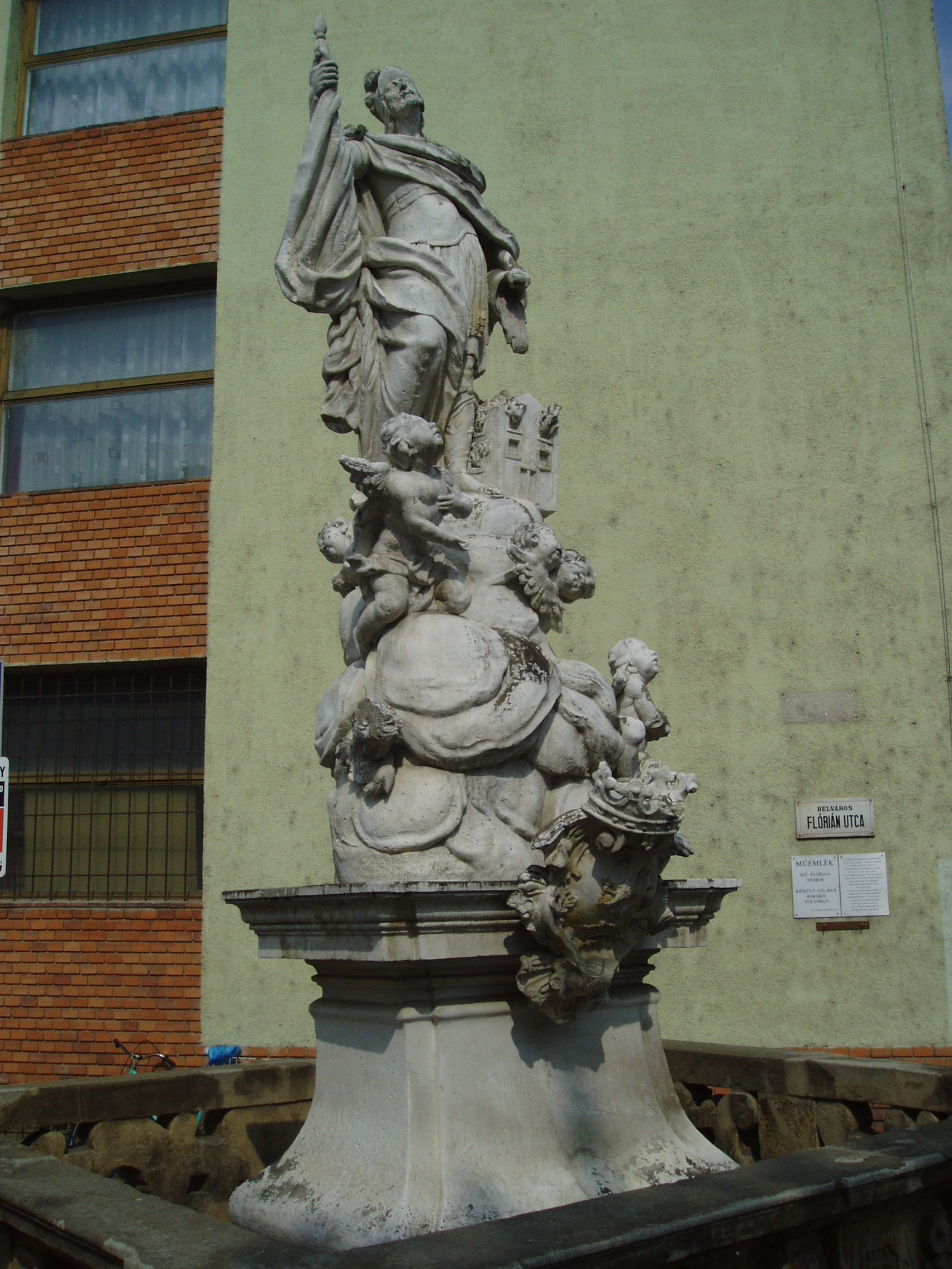 Nyilvános 1196 | 2296 | Pápa, Flórián utca: Szent Flórián-szobor | A szobor 1753-ban készült rokokó stílusban. Alkotója valószínűleg azonos a Nepomuki Szent Jánost ábrázoló szoborral (lásd: Pápa, Szent István út). A szent szoboralakja puttófejekkel körülvett felhőkön áll, s a kezében levő vizesedényből egy égő házat olt. Az országos műemléki védettség alatt álló szobrot az 1960-as évekből a Szent István út 12. számú ház elől a Nagytemplom közelébe helyezték át. Onnét 2000-ben, restaurálása után hozták ide, eredeti helyének közelébe. A fénykép 2007 áprilisában készült. Felh. irod.: Németh Adél - Szabó Lajos: Pápa. Bp. Panoráma, 1989 |