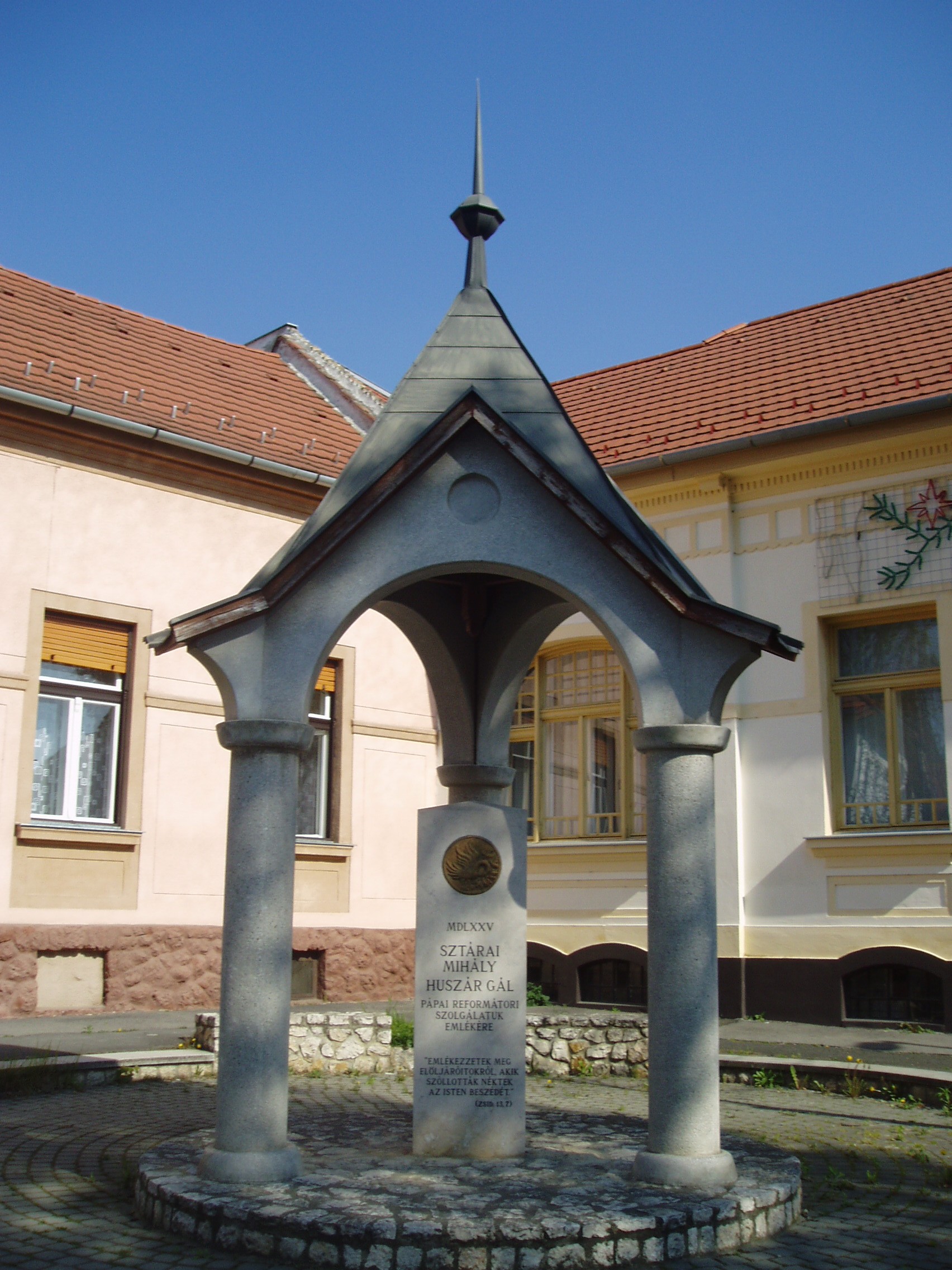 Nyilvános 1104 | 1910 | Pápa, Zimmermann utca 4. Sztárai Mihály és Huszár Gál emlékműve | Pápán szinte a reformáció kezdetétől hódítottak a protestánsok tanai. Így Sopron és Sárvár után ez a város lett a protestantizmus harmadik legjelentősebb dunántúli szellemi központja. Lelkész volt a városban Sztárai Mihály, valamint Huszár Gál és fia, Dávid. Sztárai Mihály (Drávasztára? – Pápa, 1575?), a nagy „éneklő reformátor” ferences szerzetesből lett a reformáció híve és egyik legeredményesebb terjesztője. Laskón (Tolna megye), majd Tolna városában, később Sárospatakon működött, onnét jött Pápára 1567 őszén. Hét–nyolc évet töltött itt lelkészként, utolsó éveiben Huszár Gállal együtt. Huszár Gál (1512 k. – Pápa, 1575. okt. 23.) eredetileg katolikus pap volt, de csatlakozott a reformációhoz, s a katolikus egyház kiátkozta. Egész nagyhatású munkásságát a reformáció szolgálatába állította. Zaklatott életet élt, mert az ellenreformáció többször elűzte helyéről: Magyaróvárott, Kassán, Debrecenben, Nagyszombaton, Komáromban, Rózsavölgyben, Komjátiban tevékenykedett. Élete utolsó évét töltötte Pápán, ahol 1575. október 23-án, 63 éves korában pestisben hunyt el. Halála napját állítólag korábban többször megjövendölte. Tevékenységét a városban fia, Huszár Dávid folytatta, aki 1577-ben itt nyomtatta ki a Heidelbergi Káté első magyar fordítását. Sztárai Mihály és Huszár Gál közös emlékművét a Zimmermann utca 4. számú épület előtt állították fel, közel az Anna térhez, amelynek azóta felszámolt temetőjében nyugodtak a hagyomány szerint Huszár Gál hamvai. A fénykép 2007 áprilisában készült. Felh. irod.: Németh Adél – Szabó Lajos: Pápa. Bp. Panoráma, 1989 Pápa. Szerk. Sz. Farkas Aranka. 2. kiad. Veszprém-Bp., Magyar Képek, 2000. http://church.lutheran.hu/reformatio/ppanteon/pp_ev_huszar_gal.htm Fabiny Tibor: Az evangélikusok Pápán. = w.mek.iif.hu/porta/szint/tarsad/tortenel/helytort/papa_1 |