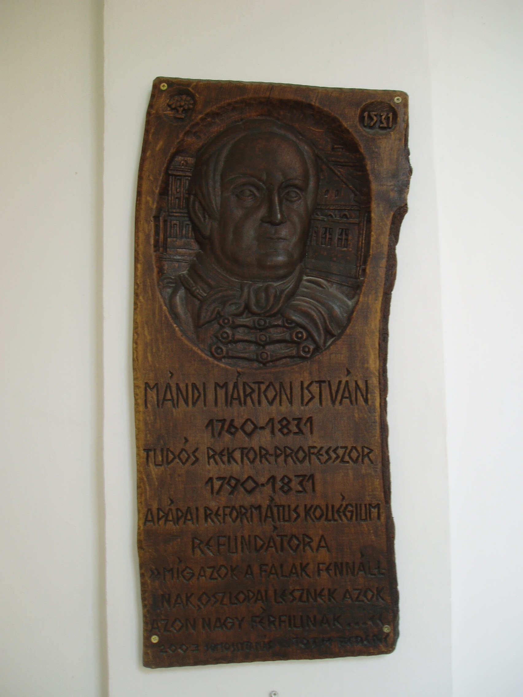 Nyilvános 1022 | 1669 | Pápa, Március 15. tér 9. Pápai Református Kollégium Gimnáziuma | A híres pápai Református Kollégium első épülete 1531 és 1752 között a mai Ruszek közben, a Lábasház épületének helyén állott. 1752-ben - Mária Terézia rendeletének következtében, amely megszüntette a szabad vallásgyakorlást - harminckét évig csak a közeli Adásztevelen működhetett. 1784-ben, II. József türelmi rendeletének köszönhetően térhetett vissza az iskola Pápára, s hamarosan felépült a ma Ókollégiumként ismert épület (lásd: Pápa, Petőfi u. 13.), amelyben 1794-ben indulhatott meg az oktatás. Az intézmény 1857-ig működött ott, ekkor átköltözött a Március 15. tér 13-15. számú házba, az ún. Nátus-ba, majd 1895-ben utolsó végleles helyére, ide, a Március 15. tér 9. számú monumentális új épületbe. Az iskola folyosóin számtalan emléktábla, szobor, dombormű idézi az egykori kiváló tanárok, jeles diákok alakját. A képen Mándi Márton István fa reliefje látható, amely Somosi Tamás munkája. Mándi Márton István (Iszkaszentgyörgy, 1760. nov. 23. – Pápa, 1831. szept. 21.) nyelvész, tanár, filozófus. Kecskeméten, Debrecenben, majd Göttingában tanult. 1790-től volt a pápai református gimnázium rektor-professzora. Nevéhez fűződik az iskola új fellendülése. A filozófiában Kant követője volt és 1795-ben már Kant tanítása alapján tartott előadásokat, amelyekért súlyos bírálat érte. Síremléke az Alsóvárosi temetőben van (lásd: Pápa, Alsóvárosi temető,: Mándi Márton István sírja); márvány mellszobra, Izsó Miklós alkotása a református könyvtárban látható. A fénykép 2007 áprilisában készült. Felh. irod.: Németh Adél - Szabó Lajos: Pápa. Bp. Panoráma, 1989 http://refi-papa.hu |