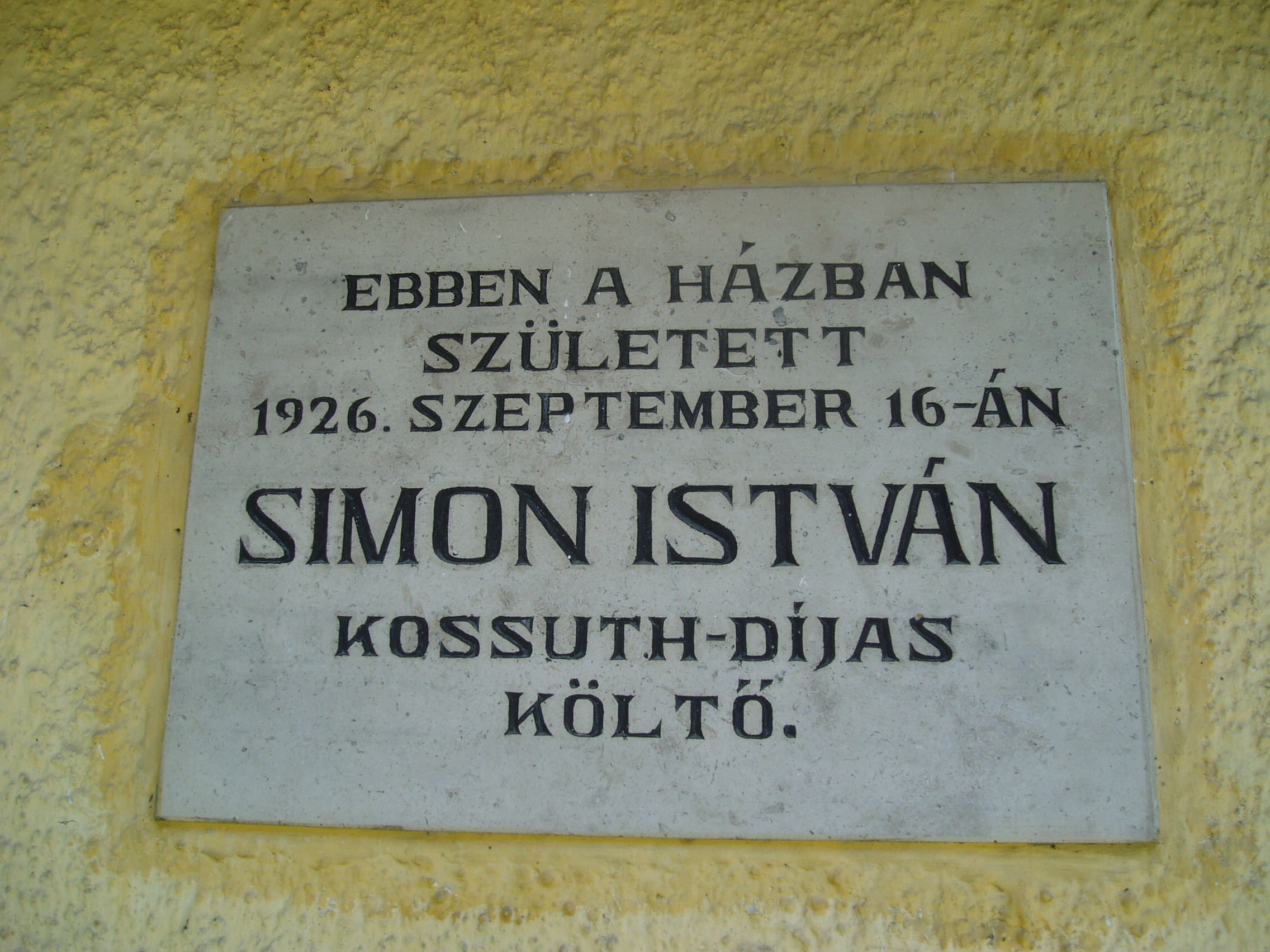 Nyilvános 1317 | 2834 | Rövid leírás | Teljes leírás (1.18 KB) | Bazsi, Fő út 149. 1926. szeptember 16-án itt, az udvari házrészben született Simon István költő. A kis épületet 1983. április 11-én, a költészet napján, országos ünnepség keretében avatták emlékházzá. Benne ma is a költő szüleinek eredeti bútorai és tárgyai láthatók, Simon Istvánról szóló dokumentációval kiegészítve. Simon István tizennyolc éves koráig élt Bazsiban. A sümegi gimnáziumot bejáró diákként végezte el. 1948-tól Budapesten lakott, de gyakran hazajárt szülőfalujába. Számos, ebben a házban készült fényképen látható idős szüleivel a már nagy elismertséget elért költő. 1975 nyarán nagybetegen került a sümegi kórházba, ahol július 6-án elhunyt. Kívánságának megfelelően Bazsiban temették el (sírjánál sajnos nem jártam, a temető elég messze van a falutól - K.K.). A szegényparaszti környezet, a szülőföld, a Sümeg környéki táj mindvégig éltető eleme volt költészetének. A fénykép 2007 júniusában készült. Felh. irod.: Erős Zoltán: Magyar irodalmi helynevek A-tól Z-ig. Bp. Kis-Lant Kiadó, 1995 |