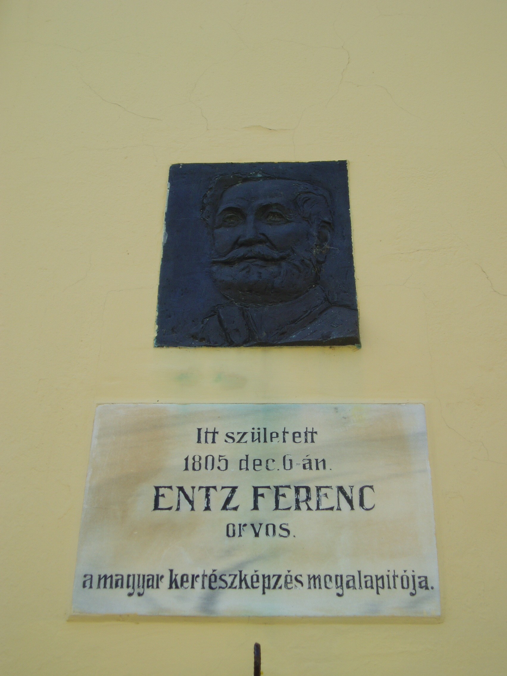 Nyilvános 1005 | 1699 | Sümeg, Ramassetter utca 6. | A Ramasetter utca házai jórészt a XVII. század második felében épültek, bár a legtöbbet később átalakították. A 6. számú ház homlokzatán olvasható emléktábla szerint itt született Entz Ferenc. Entz Ferenc (Sümeg, 1805. dec. 6. – Promontor–Budafok, 1877. máj. 8.) orvos, szőlész, kertész. A szabadságharcban honvéd főorvos volt, ezért Világos után eltiltották az orvosi tevékenységtől. Ekkor fordult a kertészet és szőlészet elméleti és gyakorlati kérdései felé. Megírta korának alapvető kertészeti szakkönyvét. Nagy érdeme a kertészeti műnyelv kialakítása, amelyre a mai kertészeti szaknyelv is épül. 1853-ban Pesten létrehozta az első magyar kertészképző iskolát. Édespja a város köztemetőjében nyugszik (lásd: Sümeg, Temető: Entz Ferenc sírja). A fénykép 2007 júniusában készült. Felh. irod.: Koppány Tibor - Kozák Károly: Sümeg útikalauz. Veszprém, Idegenforgalmi Hivatal, 1965 Veszprém megyei életrajzi lexikon. Veszprém, Veszprém Megyei Önkormányzat Közgyűlése, 1998 www.ekmk.hu/emlekhely/Emlekhelyek.html |