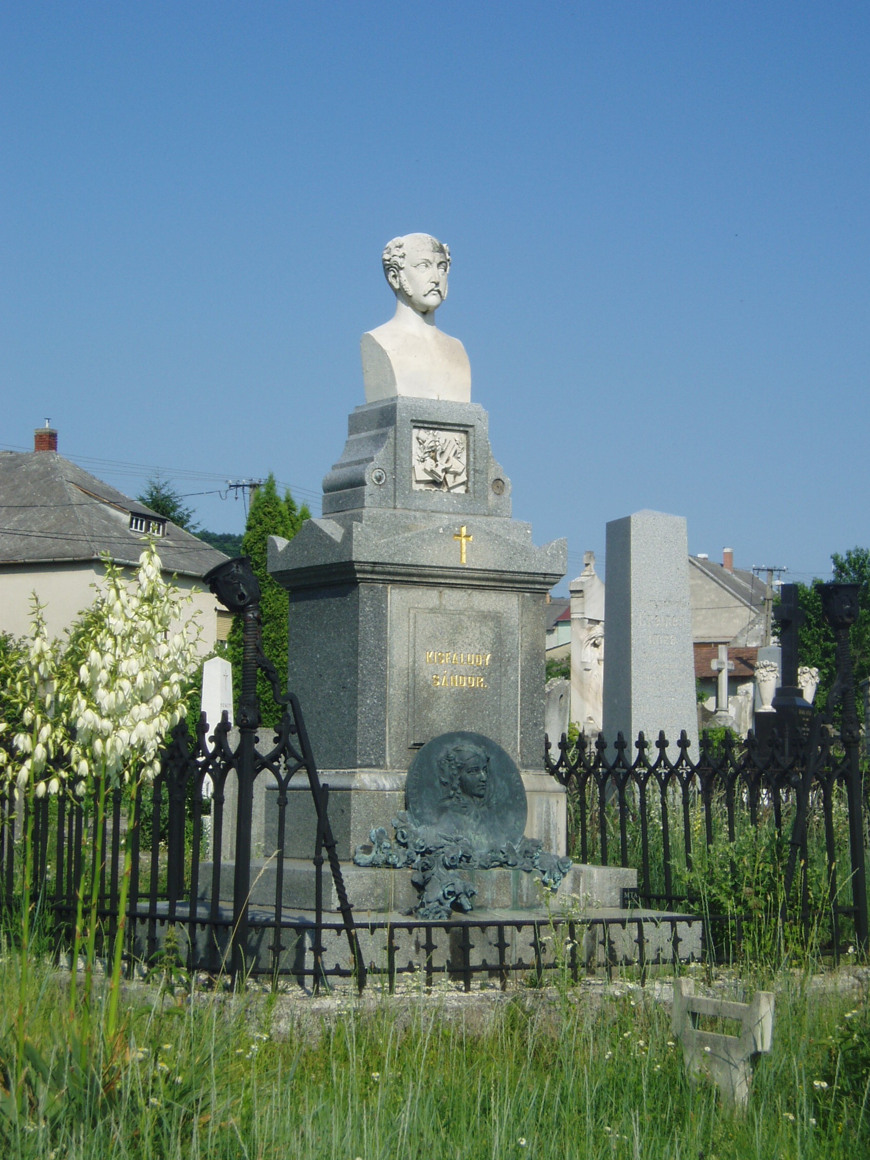 Nyilvános 1092 | 2063 | Sümeg, Temető. Kisfaludy Sándor és Szegedi Róza sírja | Sümeg délkeleti határában, a Tapolcára vezető út mellett emelkedő lankás domboldalon találjuk a város köztemetőjét. Helyét még Bíró Márton püspök jelölte ki; jelentősebb számban a XIX. század eleje óta kezdtek ide temetkezni. A temetődomb tetején áll az 1816-ban épített, későbarokk stílusú temetőkápolna. Körülötte a sümegi élet utolsó két évszázada szinte valamennyi híres személyiségének sírja fellelhető. A temető leglátogatottabb síremléke Kisfaludy Sándor (1772-1844) és felesége, Szegedy Róza (1775-1832) sírja. A korábban elhunyt Szegedy Róza földi maradványait az 1900-as évek elején helyezték át férje sírjába. Akkor már a költő sem eredeti helyén nyugodott, erre a díszsírhelyre 1869-ben hozták át koporsóját. A timpanonos lezárású szürke gránit sírkövet megkoronázó Kisfaludy Sándor-mellszobor Gerenday Antal 1869-ben készített alkotása. A sír háromlépcsős talapzatának középső fokára helyezték Szegedy Róza lépcsőre hulló rózsákkal díszített portrédomborművét, amelyet Istók János készített 1904-ben. A fénykép 2007 júniusában készült. Felh. irod.: Koppány Tibor - Kozák Károly: Sümeg útikalauz. Veszprém, Idegenforgalmi Hivatal, 1965 Sümegi kalauz. Sümeg, Sümegi Fórum Alapítvány, 1993 Miklósi-Sikes Csaba: Kőbe vésett történelem. A sümegi városi temetők története és sírjelei 1950-ig. Sümeg, Sümegi Fórum Alapítvány, 2002 Veszprém megyei életrajzi lexikon. Veszprém, Veszprém Megyei Önkormányzat Közgyűlése, 1998 |