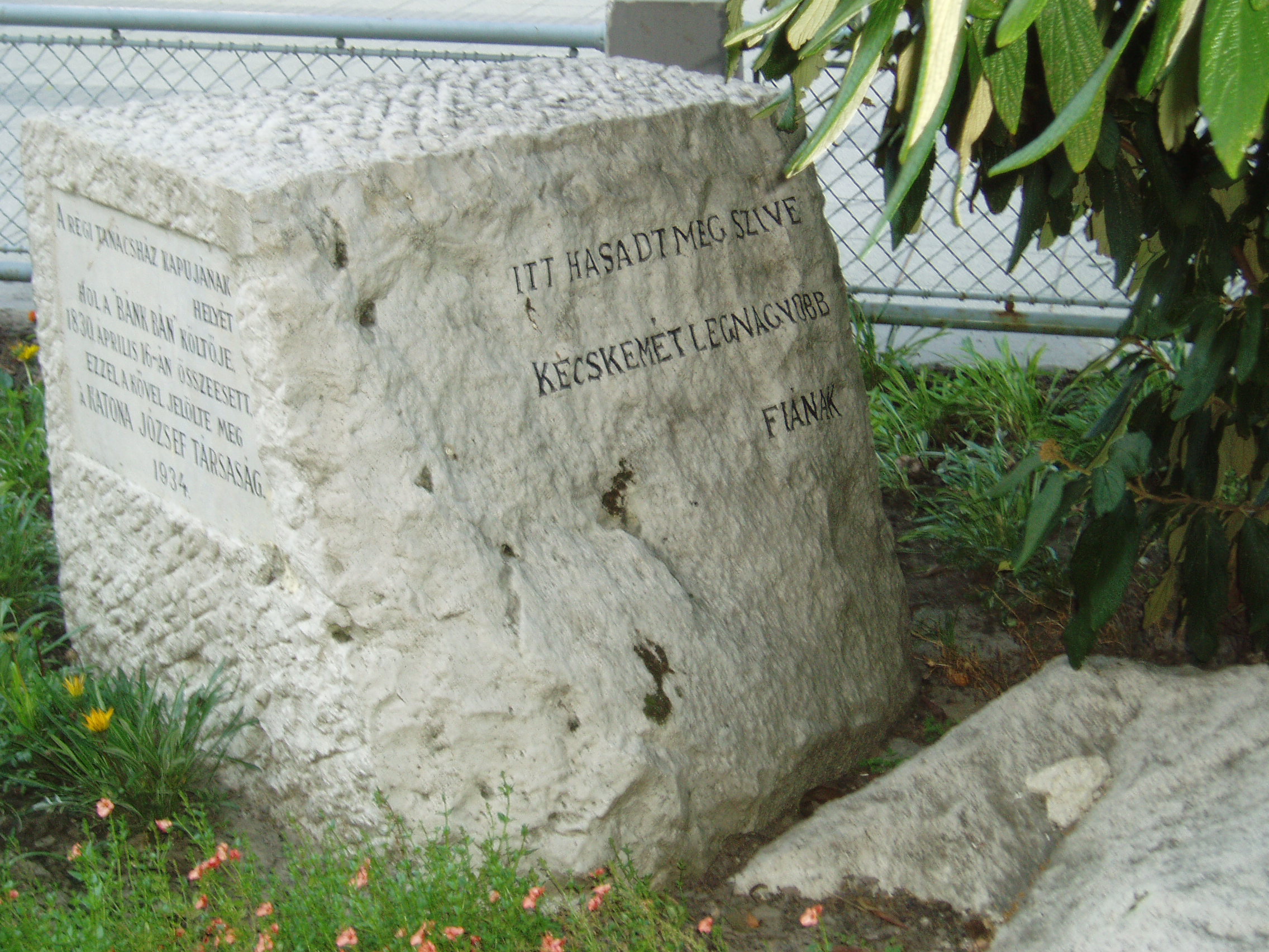 Nyilvános 1085 | 1798 | Kecskemét, Kossuth tér 1. | A szecessziós stílusú városháza 1892-1896 között épült Lechner Ödön és Pártos Gyula tervei szerint. Helyén egykor a régi városháza állott, ott dolgozott Katona József, mint városi ügyész, majd főügyész. Egy zsúfolt délelőtt után, miután megebédelt, egy kollégájával beszélgetve visszafelé tartott hivatalába, amikor a belső folyosón összeesett és szívszélhűdésben elhunyt. Halálának helyén, amely a mai épület előtt található, emlékkövet helyeztek el 1934-ben a következő szöveggel: "Itt hasadt meg a szíve Kecskemét legnagyobb fiának". A fénykép 2006 augusztusában készült. Felh. irod.: Heltai Nándor: Kecskemét. Kecskeméti Lapok, 1998 |