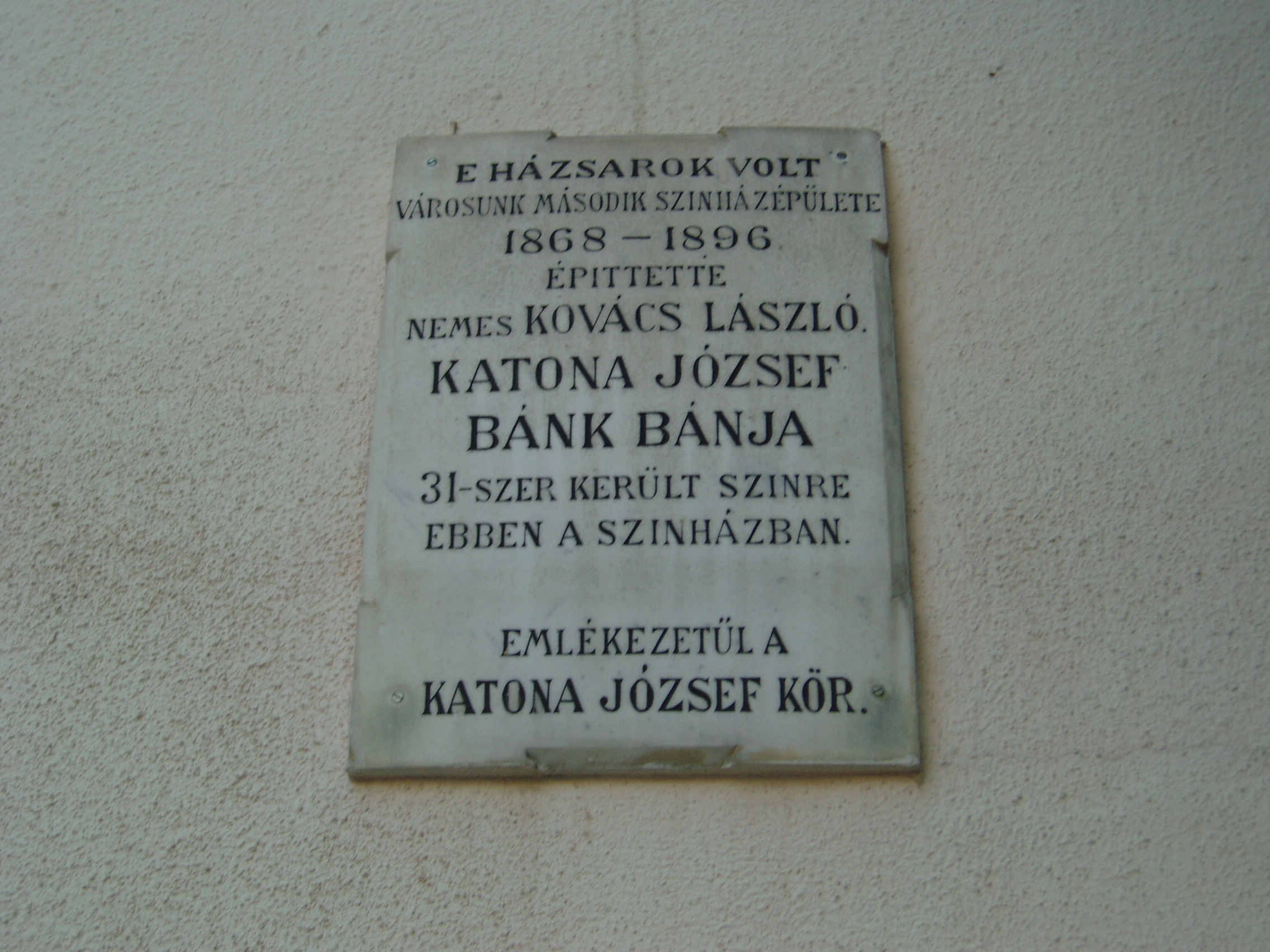 Nyilvános 1083 | 1599 | Kecskemét, Katona József tér 3. | Az épület homlokzatán olvasható emléktábla szerint 1868 és 1896 között itt - egész pontosan kicsit odébb, a Katona József tér és a Batthyány utca sarkán - állt Kecskemét második állandó színházépülete. Kecskemét első állandó színháza, amely egykor a mai művelődési központ mögött állott, kezdettől fogva nehezen felelt meg a kívánalmaknak. Egy helybeli polgár, Kovács László 1862-ben ajánlatot tett a városnak új színház építésére. Miután évekig hiába várakozott kedvező válaszra, 1868-ra saját erejéből és a maga elgondolása alapján mégis megépítette a színházat háza magas, nagy pincéje fölé, a Nádor vendéglővel egy telken. 1868. december 26-án Katona József Bánk bánjával avatták fel. Az épület 1896-ig állott a színjátszás szolgálatában, ekkor nyílt meg — e játszóhely szomszédságában — Kecskemét első méltó színházépülete, a mai Katona József Színház (lásd: Kecskemét, Katona József tér 5.). A fénykép 2006 augusztusában készült. Felh. irod.: Bács-Kiskun megyei történeti és kegyeleti emlékhelyek számbavétele. Kecskemét, 1989 Joós Ferenc: A vándorszínészettől az Állami Színházig. Kecskemét, 1957. /Kiskunság Kiskönyvtára 3./ |