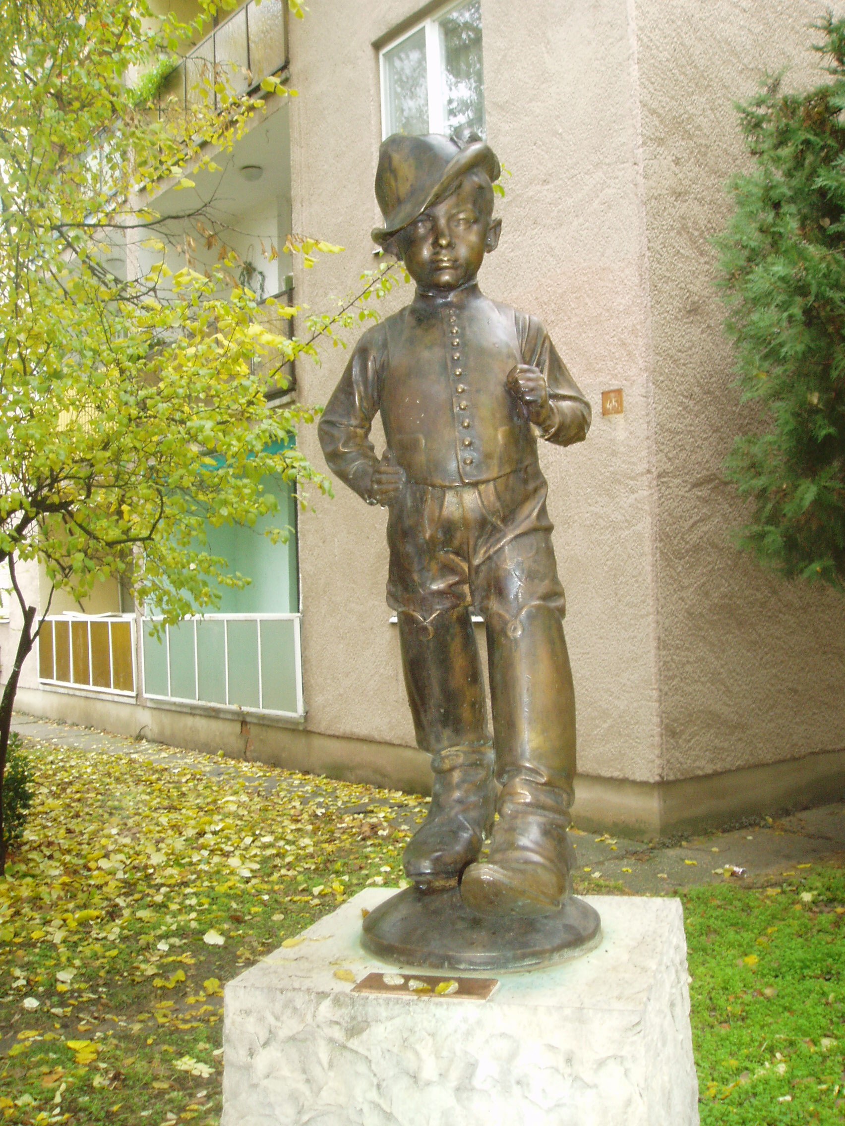 Nyilvános 1100 | 2032 | Baja, Kölcsey utca 45. Hüvelyk Matyi szobra | A József Attila lakótelepen, a Kölcsey utca 45. számú épület előtt áll Telcs Ede: Hüvelyk Matyi című kedves szobra. A kecskeméti Katona József Könyvtár honlapján közzétett "Történelmi és kegyeleti emlékhelyek" című összeállítás szerint a szobor csak másolat, eredeti példányát a Türr István Múzeum őrzi. Alkotója, Telcs Ede Baján született 1872-ben (lásd: Baja, Táncsics M. u. 28.). A fénykép 2007 októberében készült. |