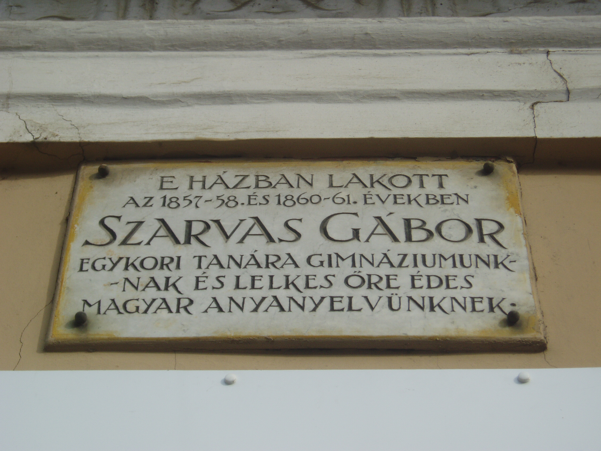 Nyilvános 1085 | 1546 | Baja, Szabadság út 22. | A homlokzaton elhelyezett emléktábla tanúsága szerint ebben a kis házban lakott Szarvas Gábor nyelvész (1832-1895) 1857-1858-ban, majd 1860-1861-ben, amikor a bajai gimnázium (lásd: Baja, Szent Imre tér 5.) tanára volt. A magyar nyelvművelés megteremtője Egerben, Baján, Pozsonyban, majd Pesten működött tanárként. Országos hírnévre nyelvészeti munkásságával tett szert. A Magyar Tudományos Akadémia megbízásából ő indította be 1872-ben a Magyar Nyelvőr című, máig létező folyóiratot. Nyelvészként állást foglalt az erőszakos nyelvújítás és az idegenszerű fordulatok ellen. Kutatásai során tisztázta a nyelvújítás határait. Eredményes munkássága elismeréséül a Magyar Tudományos Akadémia levelező, majd rendes tagjává választották. A fénykép 2007 októberében készült. Felh. irod.: Bálint László: A bajai III. Béla Gimnázium. Bp. 1989, Tankönyvkiadó. /Iskolák a múltból./ Magyar életrajzi lexikon |