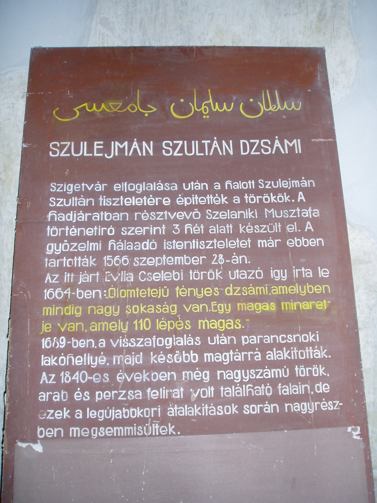 Nyilvános 1173 | 1947 | Szigetvár, Vár: dzsámi | A vár egyik központi épülete a Szulejmán dzsámi, amely a győztes szultán tiszteletére épült a XVI. században. A téglalap alaprajzú dzsámi Mekka felé néző oldalán látható a kőkeretes, egykor csempével borított, szalaktit boltozatú imafülke (mihrab). A dzsámit L alakú folyosó veszi körül, ennek délkeleti oldalán egy másik mihrab fülke található. Északnyugaton csatlakozik a dzsámihoz a szabályos tizennégyszög alakú minaret, amelynek nagy része a XVIII. században leomlott. A fénykép 2005 júniusában készült. Felh. irod.: Török műemlékek Magyarországon. = www.terebess.hu/keletkultinfo/minaret/szigetvar.html |