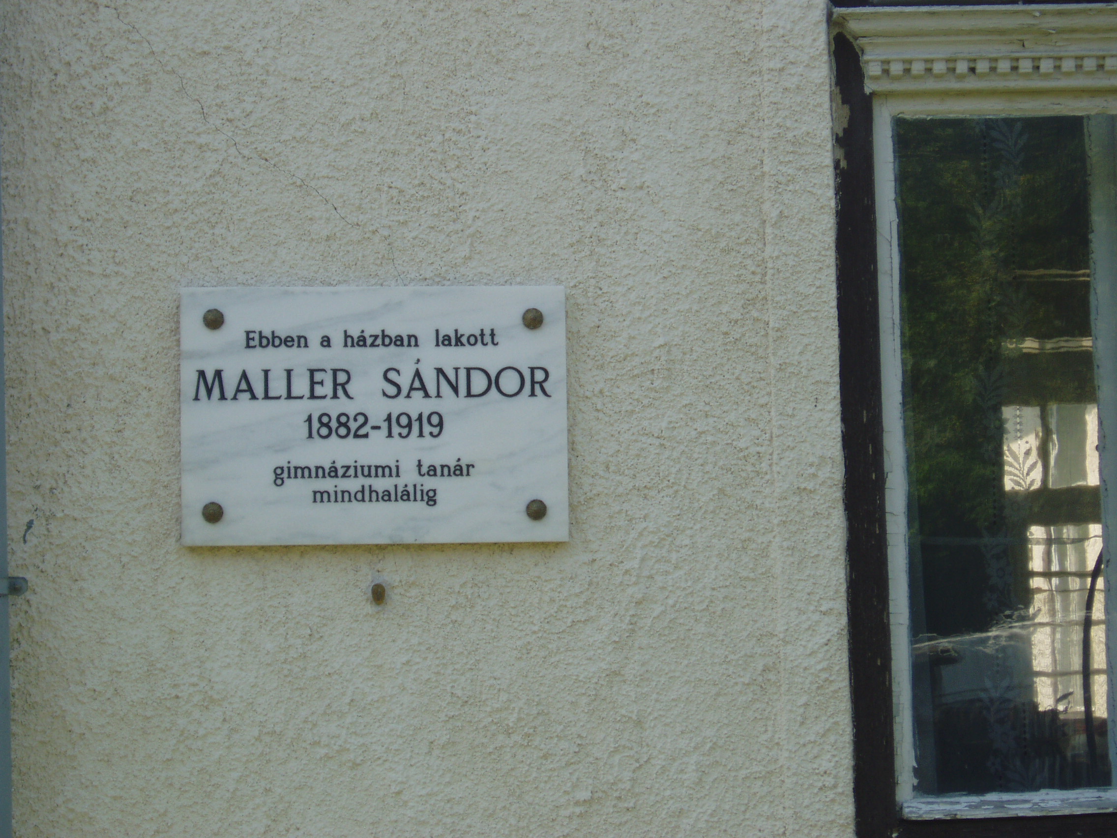 Nyilvános 1390 | 3149 | Rövid leírás | Teljes leírás (716 B) | Sárospatak, Comenius utca 10. Az emléktábla tanúsága szerint ebben a házban lakott "mindhalálig" Maller Sándor (1882-1919), a pataki Református Főiskola megbecsült tanára. 1919-ben a tápintézet (lásd: Sárospatak, Comenius u. 1.) ablakán keresztül egy orvlövész oltotta ki életét. Emlékére a főiskola alapítványt létesített "az év legjobb matematikus diákja" számára. Fia, az 1917-ben született Maller Sándor is jeles tanára volt a Kollégiumnak, majd a Magyar UNESCO Bizottság titkára lett. 2001-ben hunyt el. A fénykép 2007 augusztusában készült. Felh. irod.: www.patakidiak.hu www.zemplenimuzsa.hu |