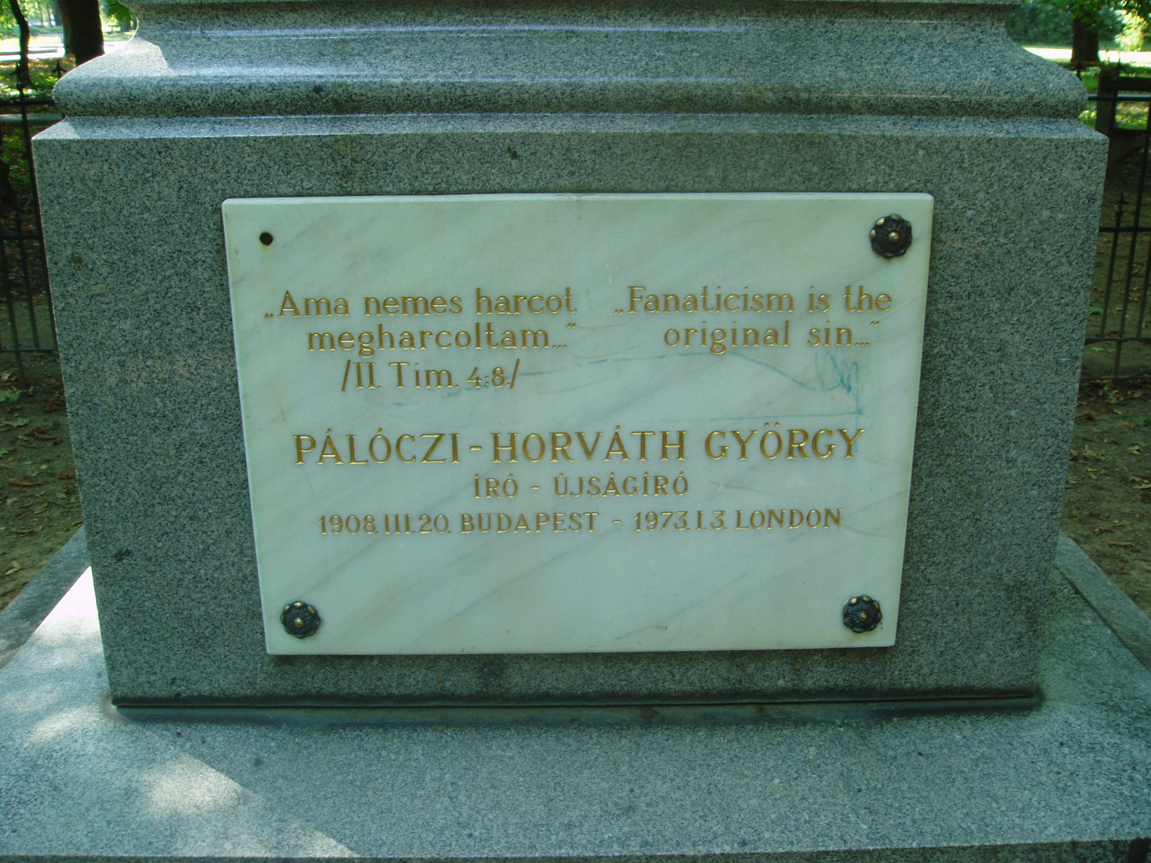 Nyilvános 1020 | 1520 | Sárospatak, Iskolakert: Pálóczi-Horváth-emlékmű | A Református Kollégium (lásd: Sárospatak, Rákóczi u. 1.) bejáratával szemben találjuk az Iskolakertnek nevezett parkot. Az 1980-as években természetvédelmi területté nyilvánított Iskolakert sajátos nemzeti érték, mely egyedülálló az országban. Sétányai mentén Patakhoz kötődő jeles személyiségek szobrai állnak. 1870 körül avatták fel az Iskolakertben a Pálóczi-Horváth-testvérek emlékművét. Készítője báró Vay Miklós főiskolai gondnok, szobrászművész. A rendszerváltás után itt helyezték el Pálóczi-Horváth György (1908-1973) emléktábláját (a család leszármazottja lehetett, de erre nem találtam bizonyítékot - K.K.). Az író, újságíró fordulatos életpályát futott be. Évekig élt az Egyesült Államokban, majd hazatért rövid időre, s a Pesti Napló szerkesztőségében dolgozott. Az 1930-as évek végén ismét elutazott, és Angliában telepedett le, s az angol külügyi szolgálat kötelékébe került. Isztambulban angol összekötőként ő tárgyalt a Kállay-kormány által kiküldöttekkel, akik a kormányfő megbízásából Magyarország háborúból való kiugrását készítették elő. A háború után hazatért Budapestre, s belépett a kommunista pártba. Felelős szerkesztője lett a Tovább című pártlapnak, vezette a Magyar Rádió idegen nyelvű osztályát, majd a Hungária Könyvkiadó irodalmi vezetője lett. Megválasztották a magyar ENSZ-társaság főtitkárává. 1949-ben koholt vádak alapján letartóztatták, öt évet töltött börtönben. 1954-ben rehabilitálták, 1956 végén elhagyta Magyarországot és Londonban telepedett le. Magyar nyelvű írásai főleg a londoni Irodalmi Újságban jelentek meg, amelynek főmunkatársa volt. Visszaemlékezéseit "Elveszett nemzedék" címmel írta meg. Kitűnő műfordító is volt. Londonban hunyt el 1973-ban. A fénykép 2007 augusztusában készült. Felh. irod.: Látnivalók Borsod-Abaúj-Zemplén megyében. Miskolc, Well-PRess, 1995 www.sarospatak.hu/nevezetessegek Magyar életrajzi lexikon Rainer M. János: Esetek a magyar hírszerzés történetéből, 1957-1967. = Rubikon 2002. június-július |