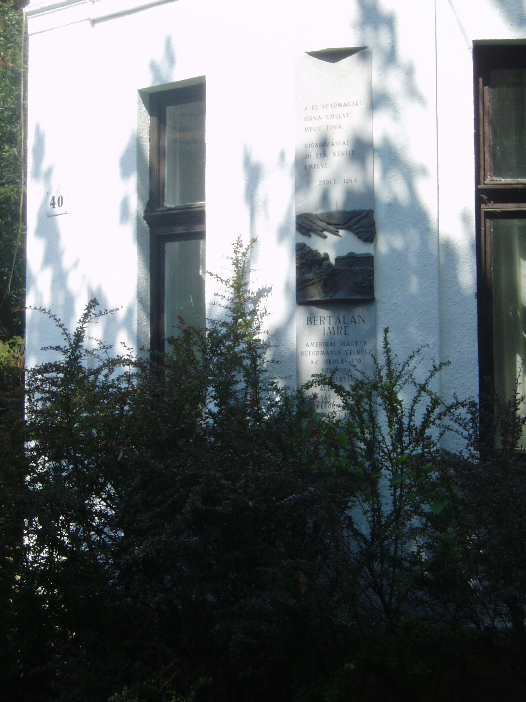 Nyilvános 1013 | 1715 | Sárospatak, Kazinczy utca 40. | Az Öregdiák vendégház, más néven Bertalan-ház homlokzatán Bertalan Imre amerikai-magyar lelkipásztor, a Református Kollégium (lásd: Sárospatak, Rákóczi u. 1.) 340. szeniora emléktáblája látható. Bertalan Imre az 1940-es évek elején volt pataki diák. A Kazinczy utcai lakóházat, ő adományozta volt iskolájának. Az épületet a kollégium alapítványa vette gondozásába, amely a mai és az öregdiákok különböző összejöveteleinek színhelyéül szolgál - a tudományos előadásoktól az öregdiák találkozókig. A fénykép 2007 augusztusában készült. Felh. irod.: Hű maradt Patakhoz. = www.patakidiak.hu/bertalan/ |