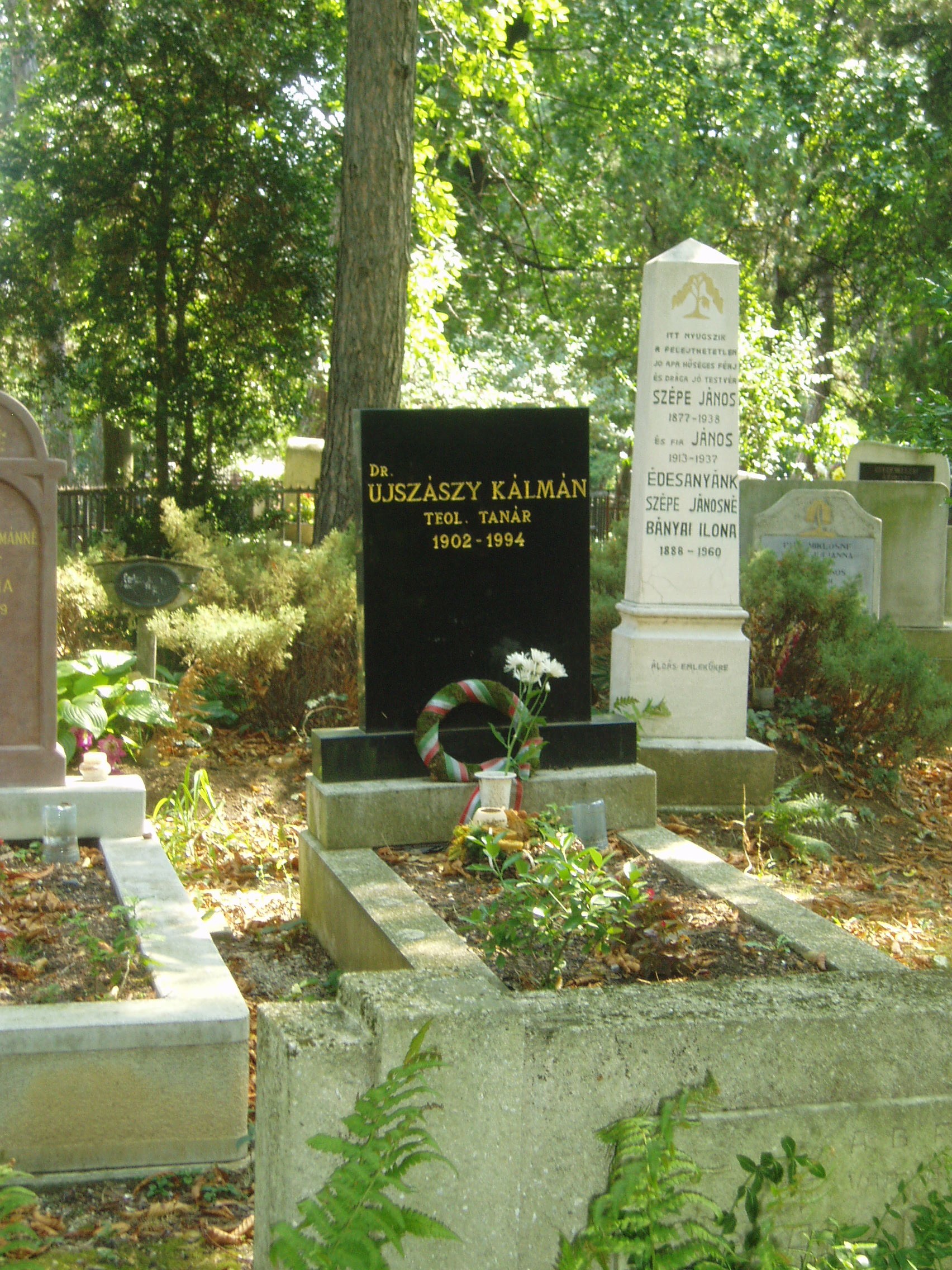 Nyilvános 1090 | 4826 | Sárospatak, Vörösmarty utca: Református temető. Gulyás József sírja | A reformátusok 1780-ban megnyitott temetőjében a Református Kollégium (lásd: Sárospatak, Rákóczi u. 1.) számos kiváló professzora nyugszik. Itt van Újszászy Kálmán sírja is is. Újszászy Kálmán Budapesten született 1902. december 13-án; a gimnáziumot is a fővárosban végezte el. 1921-től a sárospataki teológiára járt, 1931-ben ott lett teológiai akadémiai tanár, ezt megelőzően egy-egy évig Glasgow, Basel, Athén protestáns tanintézeteinek hallgatója volt. A pataki teológián a filozófiai-pedagógiai tanszéket vezette, 1932-ben filozófiai doktorátust szerzett Debrecenben, 1939-ben Szegeden egyetemi magántanári képesítést nyert A falunevelés szellemi alapjai című értekezésével. 1931-től a Sárospatakon kibontakozó faluszeminárium, 1936-től a népfőiskola egyik irányítója, 1944-1946 között a főiskola rektora volt. A népfőiskola 1948-ban - kényszerűen - megszűnt, a református intézmények közül a tanítóképzőt 1950-ben, a gimnáziumot 1952-ben államosították. 1951-ben megszüntették a teológiát is, amely 1992-ben kezdte meg újra a működést. Újszászy professzor 1948 után a kollégium főkönyvtárosa, 1951-től a Tiszáninneni Református Egyházkerület Tudományos Gyűjteményeinek szervezője, 1952-től a Magyarországi Református Egyház zempléni egyházmegyéjének gondnoka, 1964-től 1990-ig pedig a Tiszáninneni Egyházkerület főgondnoka volt. Egykori lakását (lásd: Sárospatak, Kazinczy u. 11.) emléktáblával jelölték meg. Ebben a temetőben nyugszik Cs. Szabó László (1905-1984). Életrajzilag nem kötődött Patakhoz, de végakarata az volt, hogy itt nyugodhasson. Londoni könyyvtárát is a Kollégiumnak adományozta (lásd: Sárospatak, Rákóczi u. 1. Repositorium). (Sajnos, amikor ott jártam, se az ő, se Erdélyi János professzor sírját nem találtam meg - K.K.). A fénykép 2007 augusztusában készült. Felh. irod.: Látnivalók Borsod-Abaúj-Zemplén megyében. Miskolc, Well-PRess, 1995 Benda Kálmán beszélgetése a 90 esztendős Újszászy Kálmánnal. = Confessio 1993. 3. |