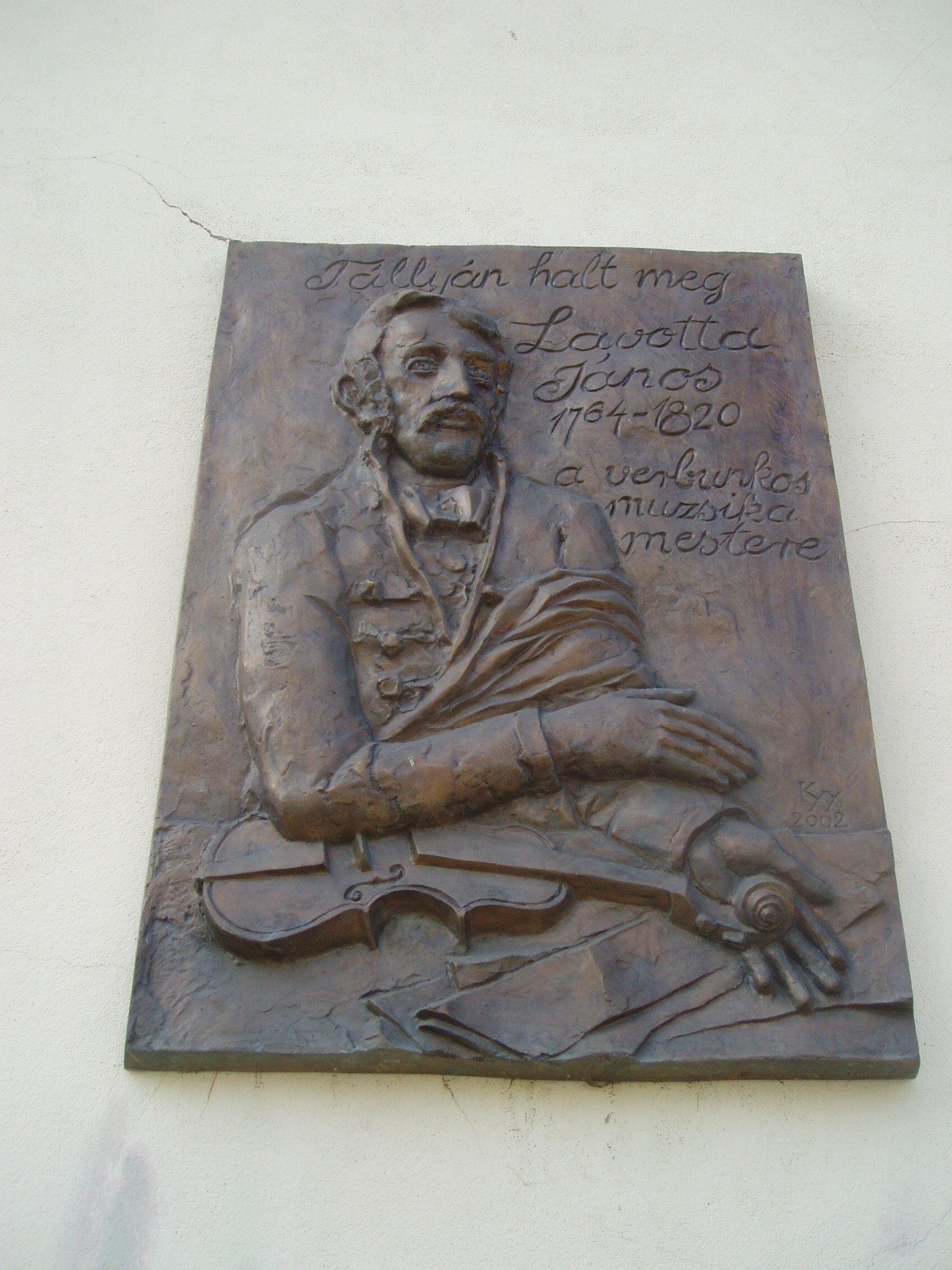 Nyilvános 1044 | 1738 | Tállya, Rákóczi utca 24. | A több évszázadra visszatekintő, szépen felújított, magántulajdonban lévő épület utcai homlokzatán Lavotta János (1764-1820) domborműves emléktáblája látható (Kiss György alkotása). A házban a XIX. század elején patika működött. Ide jött be 1820. augusztus 11-én a nagybeteg Lavotta, hogy kiváltsa gyógyszerét, amit jóbarátja, a tállyai orvos írt fel neki. Lavotta ekkoriban már jó ideje rendszertelen vándoréletet élt. Utoljára egy gesztelyi ismerősénél időzött, onnét ment Tállyára orvoshoz. A patikába belépve azonban rosszul lett, s néhány óra múlva meghalt. A tállyai hagyomány szerint halála a szemben lévő épületben (lásd: Tállya, Rákóczi utca 23.) következett be. A családtalan muzsikust halálának helyszínén temették el (lásd: Tállya, Temető). A verbunkos nagy mesterének tiszteletére a közelmúltban a Maillot-kastélyban emlékszobát is berendeztek (lásd: Tállya, Rákóczi u. 10.). Emlékét a település központjában felállított obeliszk (lásd: Tállya, Rákóczi u. 34.) is őrzi. A fénykép 2007 augusztusában készült. Felh. irod.: Szilágyi Sándor: Lavotta János. Bp. 1930. Dombóvári János: Pusztafedémestől Tállyáig. Miskolc, Szent Maximilian Kiadó, 1994 www.tallya.hu |