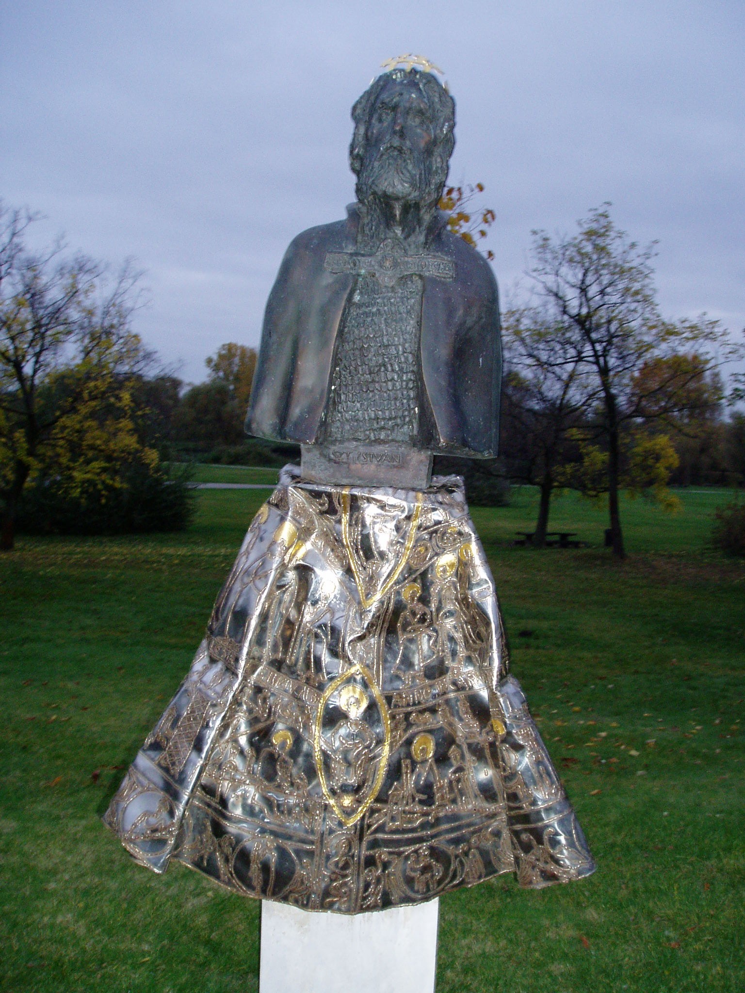 Nyilvános 1173 | 2071 | Ópusztaszer: Szent István szobra | Az ópusztaszeri Megyék Történelmi Szoborparkjában Csongrád megye állíttatta I. István király szobrát, mely Varga Imre alkotása. A szobor a romantikus Szent István ábrázolásokkal merészen szakító portré, a korhű István-ábrázolások ihletett továbbgondolása. Arcvonásai felidézik a nomád elődök életvitelén edződött férfiúi jellemvonásokat éppúgy, mint az energikus, magabiztos, hatalma és ereje tudatában lévő államférfi, a keresztény király erényeit. Az aranyozott, krómacél lemezből formált koronázó palást a fél alakot tartó oltárszerű talapzatra borul, Szent István testének megformálójaként jelképesen eggyé forrasztja Szent Istvánt és művét, a keresztény Magyarország megteremtését. A fénykép 2004 októberében készült. Felh. irod.: www.csongrad-megye.hu/turizmus/szoborpark/02.htm |