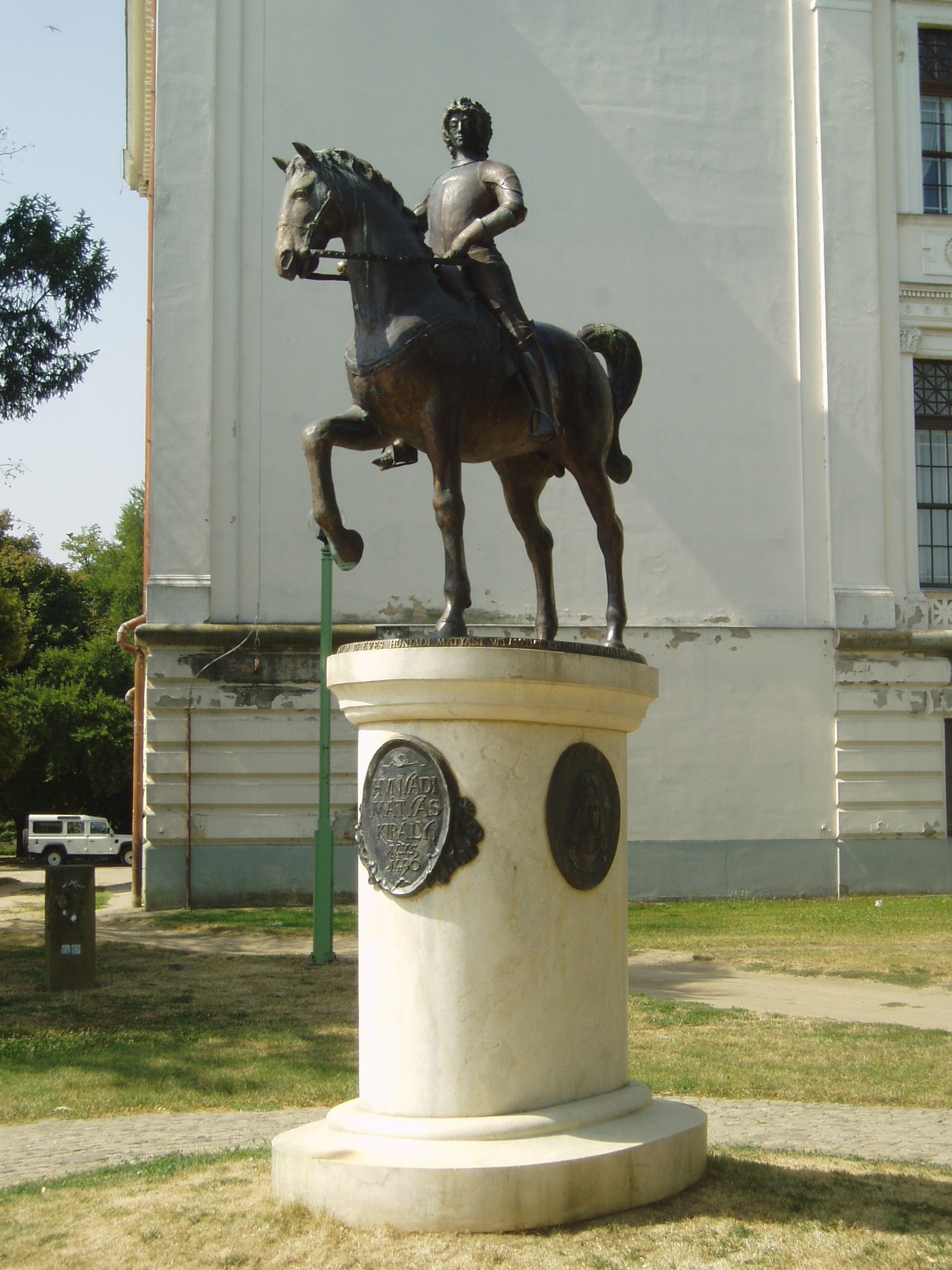 Nyilvános 1093 | 2337 | Szeged, Roosevelt tér: Mátyás király lovasszobra | A Közművelődési palota mögött, az árvízvédelmi fal kiszögellésénél, a Tisza-parton áll a 2001. augusztus 20-án átadott Hunyadi Mátyás lovasszobor, Lapis András alkotása. 1458-ban Szegeden egyeztek meg arról az ország főméltóságai, hogy a 15 éves Mátyást választják meg Magyarország királyának. A szobor talapzatának két oldalán Hunyadi János kormányzó (1407 k.–1456) és Hunyadi László (1431-1457) domborműve látható. A fénykép 2007 júliusában készült. http://users.cwi.hu/idegenvezetés |