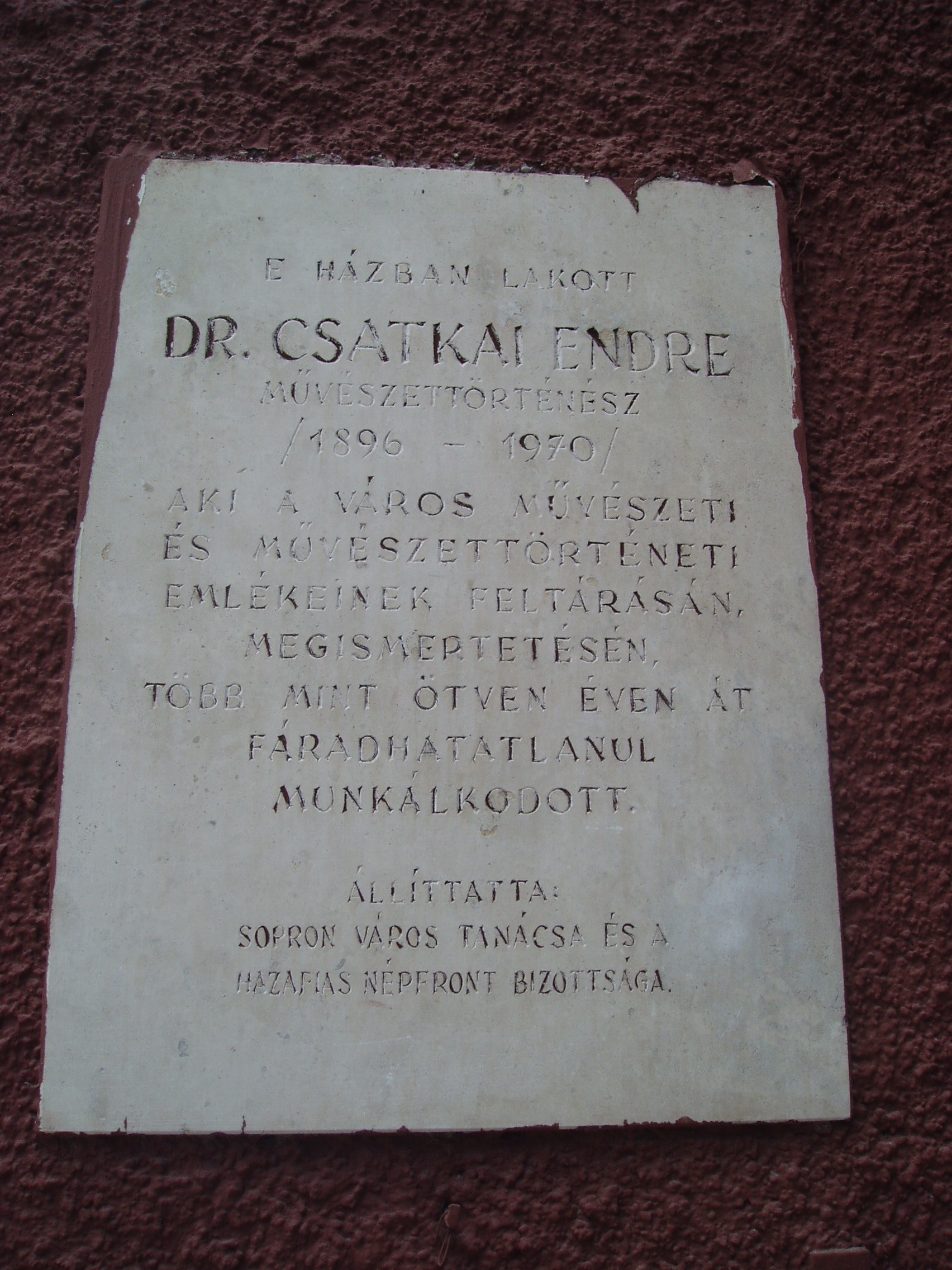 Nyilvános 1047 | 1559 | Sopron, Előkapu 10. | Sopron belvárosának főbejárata az északon nyíló Előkapu. Helye már a római korban lakott volt, majd a középkorban erődítésrendszert alakítottak itt ki. A területet a XVIII. század közepétől kezdték beépíteni lakóházakkal. Az itt álló, fűrészfogasan kialakított lakóépületek az egykori erődítés vonalát követik. Mint emléktáblája is tanúsítja, ebben a házban élt Csatkai Endre (1896-1970) művészettörténész, aki Sopron művészeti és művészettörténeti emlékeinek feltárásán, megismertetésén több, mint ötven éven át munkálkodott. Neve és munkássága megkerülhetetlen a Sopronnal ismerkedőknek. A fénykép 2008 júniusában készült. Felh. irod.: Czellár Katalin: Sopron. 3. jav. kiad. Bp. Panoráma, 2000 |