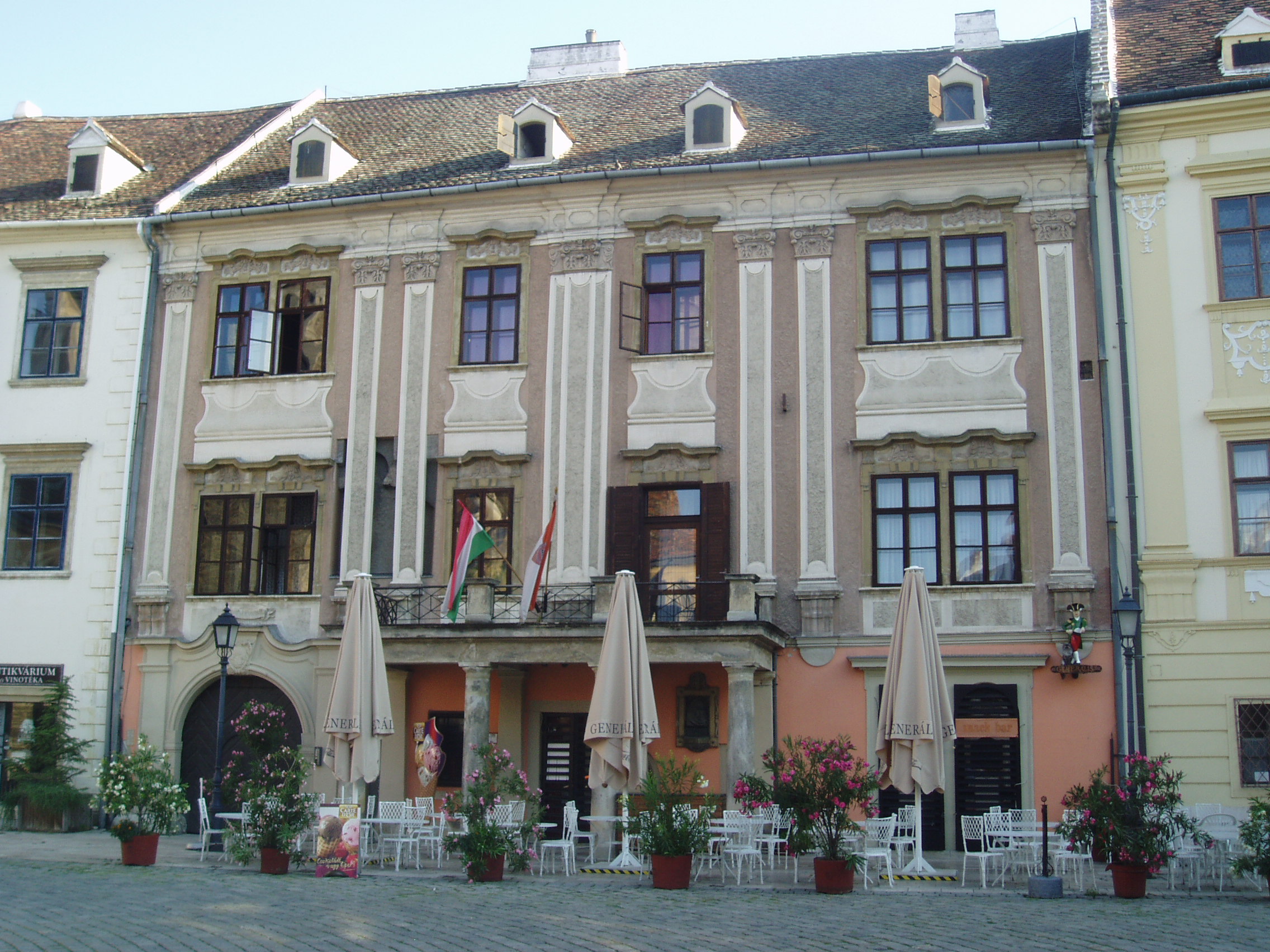 Nyilvános 1033 | 1418 | Fő tér 7. Lackner-ház vagy Tábornok-ház | Udvari, keleti szárnya és a toronyhoz csatlakozó háromszintes rész a XV. században épült. A XVII. század elején a legendás polgármester, Lackner Kristóf tulajdona volt. Ebből az időből származhat főhomlokzata. 1631-ben bekövetkezett halálával Lackner kívánságára a városra szállt, azóta is többször átépítették, illetve tűzvész okozta károk után helyreállították. A főhomlokzat előtti klasszicista erkély 180-ból származik. Ide szállásolták el egykor Sopron katonai parancsnokait, másik nevét erről kapta. A kép 2008 júniusában készült. Felh.irod.: Czellár Katalin: Sopron. 3. jav. kiad. Bp. Panoráma, 2000 |