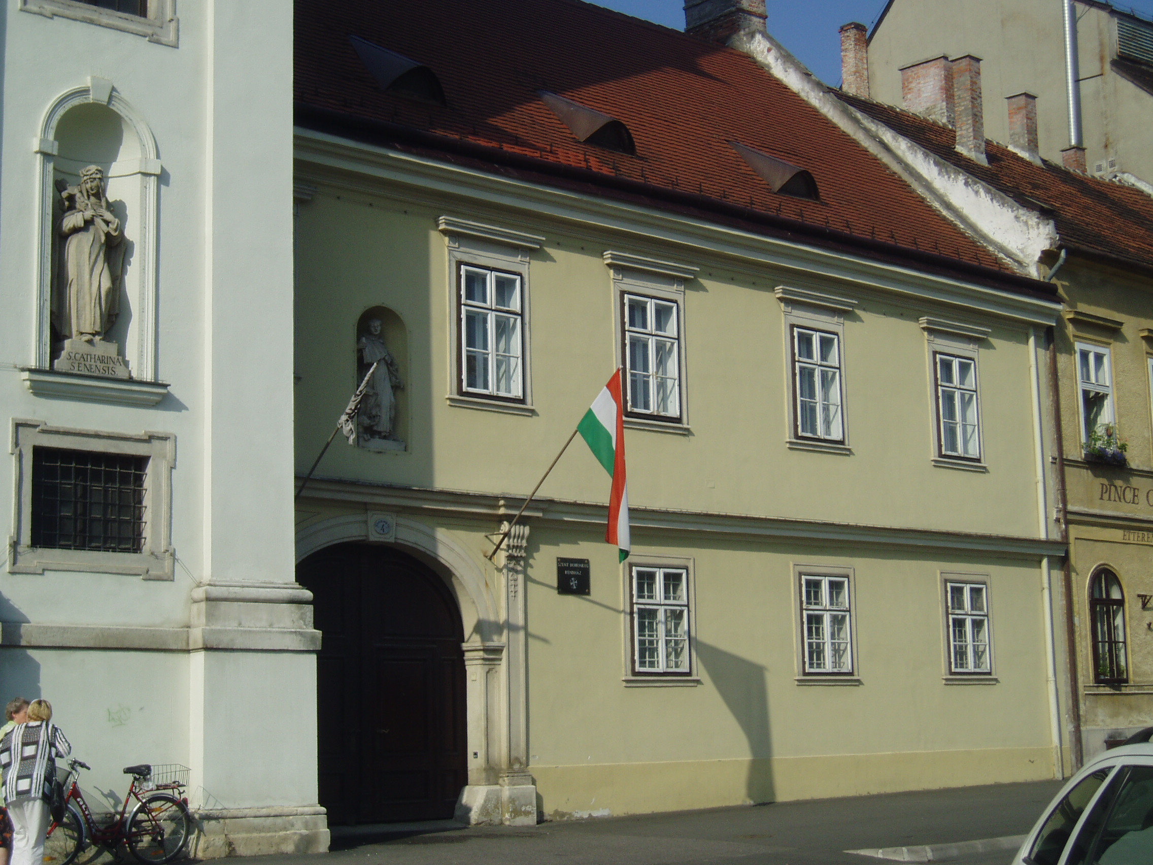 Nyilvános 965 | 1274 | Sopron, Széchenyi tér 4. | A templom mellett álló egyemeletes kolostort 1745-1750 között építették. A félköríves fülkében Szent Domonkos szobra áll. A Domonkos-rendi szerzetesek 1764-ben telepedtek le Sopronban s 1700-ban vásárolták meg a mai templom és a kolostorépület helyén álló két házat. A kép 2008 júniusában készült. Felh. irod.: Czellár Katalin: Sopron. 3. jav. kiad. Bp. Panoráma, 2000 |
