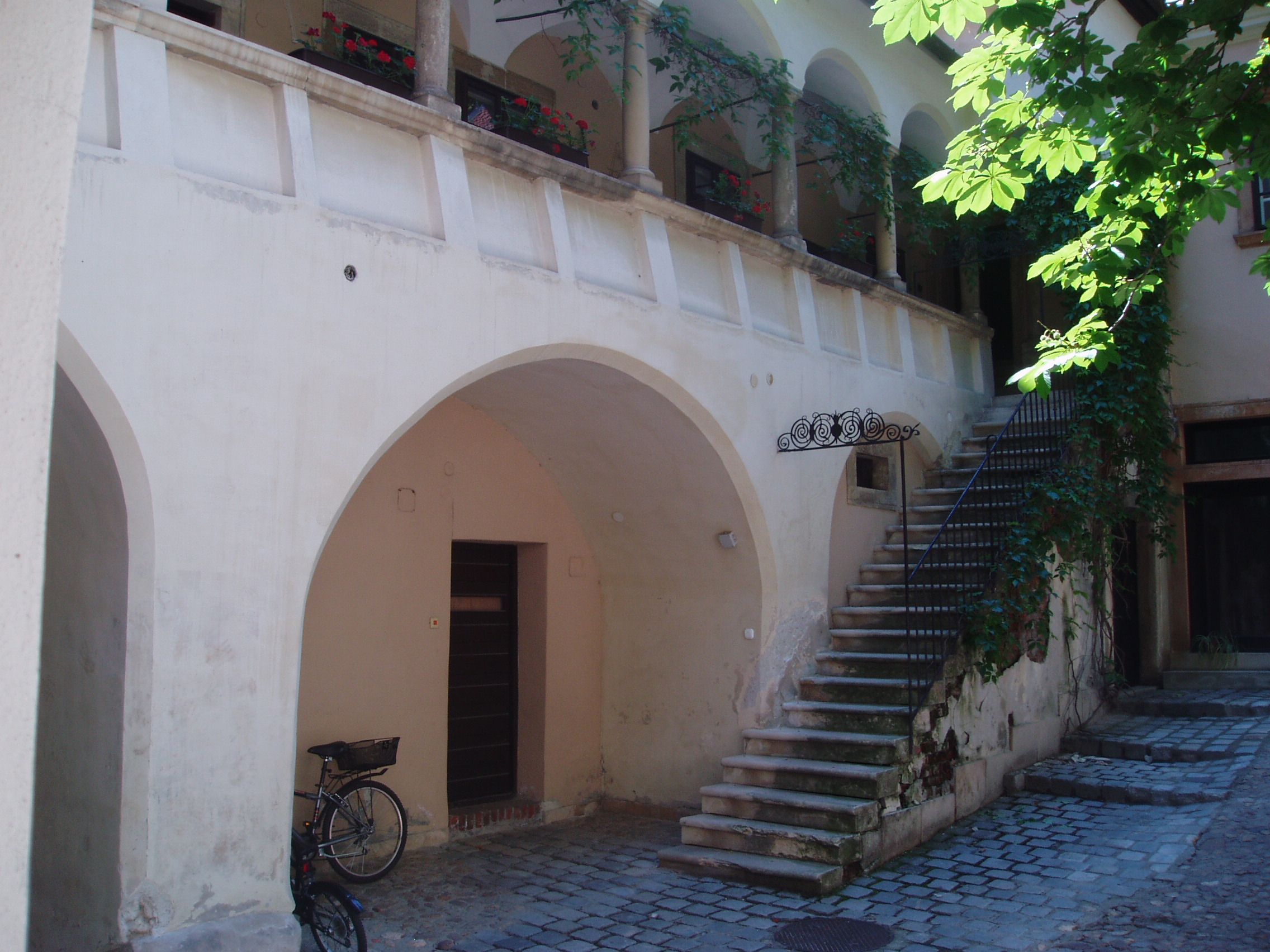 Nyilvános 983 | 1575 | Sopron, Templom utca 12. | Az eredetileg egyemeletes középkori lakóházra a XVII. századi késő reneszánsz, kora barokk átépítése során került a bejárati kapu felett félkörívesen kidomborodó zárt erkély, és ebből az időből kelteződik az udvari front kialakítása is. 1770 körül építették rá a második emeletet, amikor a Lassberg grófi család birtokába került. Az első emeleti nagyteremben ekkor városszerte híres bálokat rendeztek. 1866-ban vette meg az evangélikus konvent az épületet paplak céljaira, és azóta is az evangélikus egyház tulajdona. Dongaboltozatos, hosszú kapubejárójában a két oldalt kőráccsal díszített gótikus ülőfülkesor 1400 körül készült. A középkori eredetű épület 1866-ban került az evangélikus egyház tulajdonába, előbb paplakként hasznosították, majd ez lett Evangélikus Országos Múzeum soproni kiállítóhelye. A kép 2008 júniusában készült. Felh. irod.: Czellár Katalin: Sopron. 3. jav. kiad. Bp. Panoráma, 2000 |