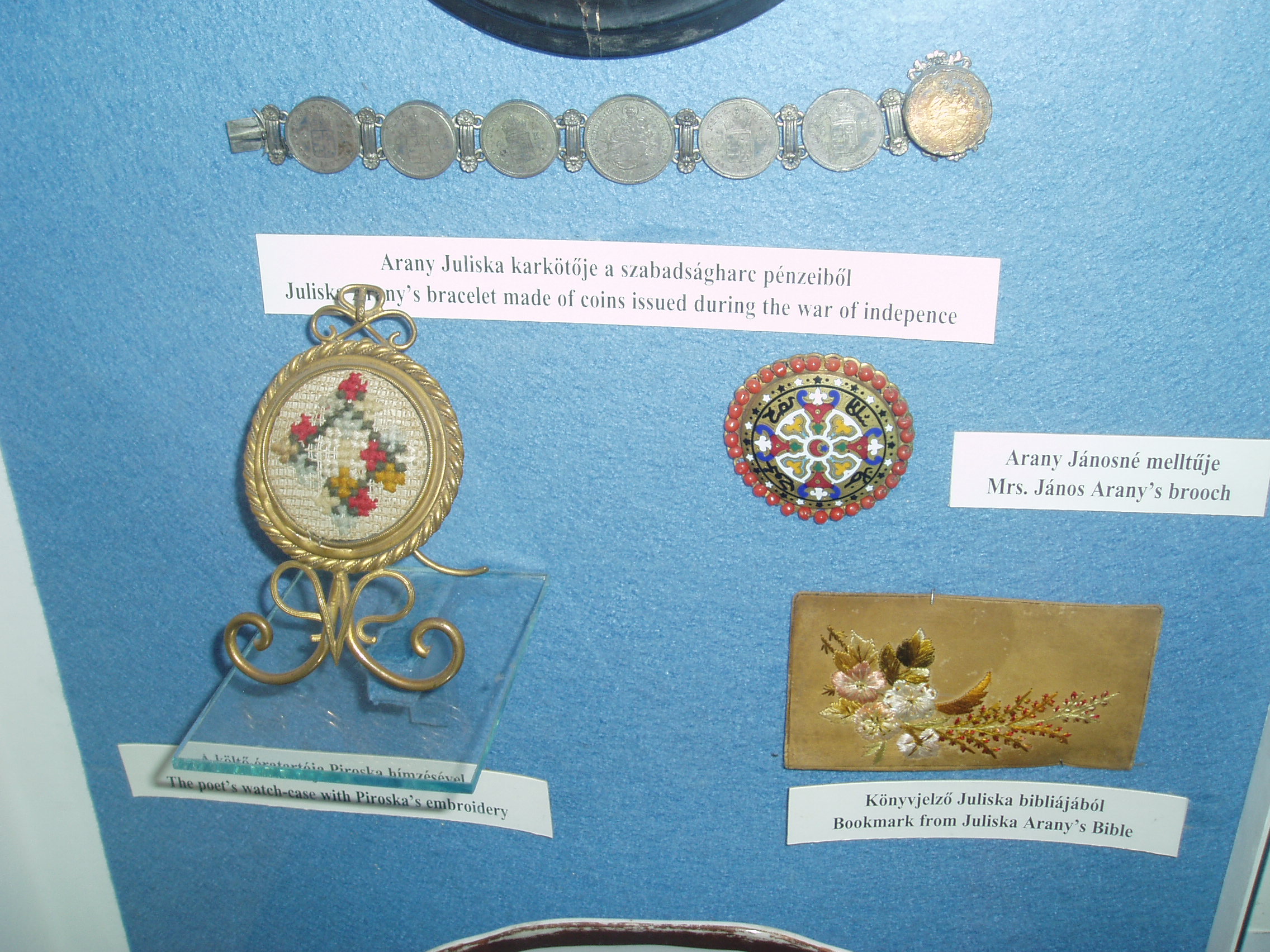 Nyilvános 1538 | 3211 | Nagykőrös, Ceglédi út 19. Arany János Múzeum | Arany János 1851 és 1860 között élt Nagykőrösön, magyart tanított a helyi gimnáziumban. A városban fennmaradt s Arany halála után a családja által adományozott relikviákból 1910-ben Arany-emlékszobát rendeztek be Arany egykori működésének helyén, a gimnáziumban. Később e relikviák az 1928-ban alapított városi, Arany János Múzeumba kerültek. A képen látható, 48-as pénzérmékből készült karkötőt a költő leánya, Juliska Nagykőrösön is viselte. A fénykép 2006 augusztusában készült. Felh. irod.: www.c3.hu/~pmiajm/hunnagyk.htm www.vendegvaro.hu Novák László: Arany János Múzeum. Nagykőrös, 2000 Törös László: A nagykőrösi Arany emlékek katalógusa. = A nagykőrösi művelődés hármas kis tüköre. Nagykőrös, 1935 |