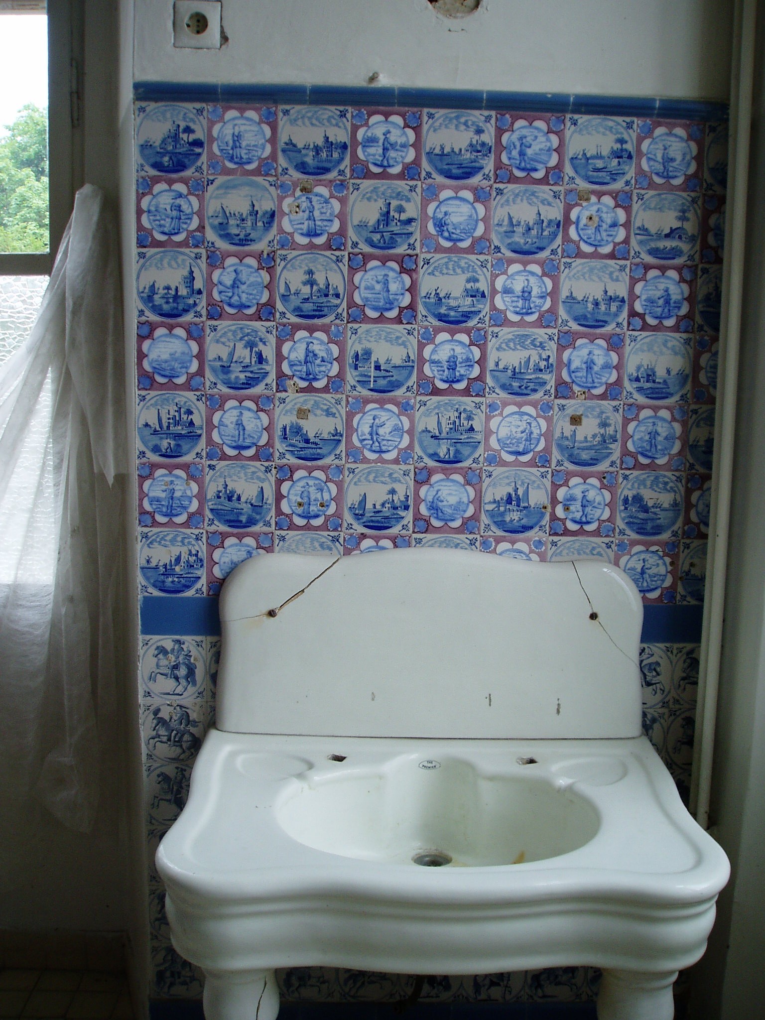 Nyilvános 1440 | 3274 | Tata, Kastély tér: Esterházy-kastély | Az Esterházy–kastély műemléki együttese az Öreg–tó partján, a középkori vár közvetlen szomszédságában áll. Fellner Jakab tervei szerint a XVIII. század második felében épült az Esterházy–család fraknói ága számára, későbarokk stílusban, a kiváló építész egyik legjelentősebb műveként. Fellner a hazai késő barokk, illetve korai klasszicizmus egyik legjelentősebb építésze, munkássága a mai napig meghatározza Tata városképét. Az épület több alkalommal is jelentős szerepet játszott a történelemben. 1809-ben I. Ferenc osztrák császár és felesége, Ludovika ide menekültek Napóleon hadai elől. Hosszú hetekig itt laktak, s az uralkodó itt, az északi szárny toronyszobájában írta alá az ún. Schönbrunni békét. 1897-ben Ferenc József és II. Vilmos német császár látogattak ide egy tatai hadgyakorlat alkalmából. 1921-ben az utolsó magyar király, IV. Károly menekült ide feleségével a balul végződött budaörsi csata után, s itt vették őket őrizetbe. A kastély eredeti berendezését sajnos széthordták, de épségben megmaradtak korabeli belsőépítészeti szerkezetei: kosáríves záródású ablakai, festett ajtói, díszes spalettái, stukkói és festett mennyezetei. A képen a XIX. század végén kialakított hollandi csempés fürdőszoba látható. Falait kézzel festett csempék borítják, s köztük nincs kettő egyforma mintázatú. A fénykép 2005. júliusában készült. Felh. irod.: Polgárdy Géza: Tatatóváros és környéke kalauza. Az 1939-es kiadás reprintje. Tata, Móricz Zsigmond Városi Könyvtár, 1998 Magyar kastélylexikon 4. Komárom-Esztergom megye kastélyai és kúriái. Bp. Perfect Project, 2003 |