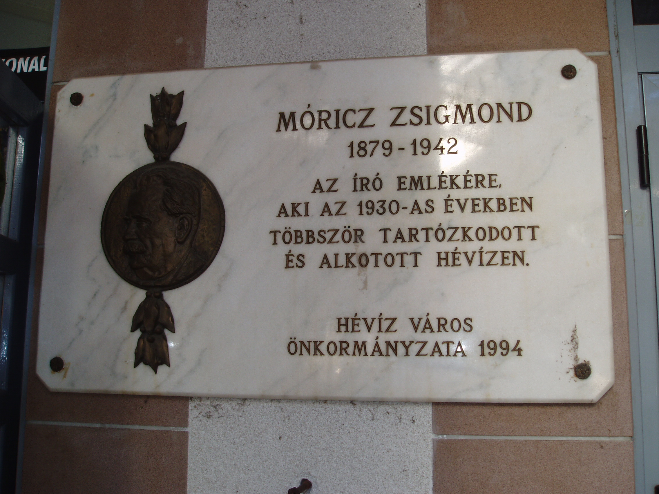 Nyilvános 1303 | 2677 | Hévíz, Schulhof sétány: Hévízi Panteon | A hévízi tó Európa legnagyobb melegvízű tava. Vize a radioaktív termálvizek közé tartozik, s különleges gyógytényező a tó fenekét több méter vastagságban borító iszap is. Gyógyhellyé Hévíz a XVIII. században vált. A XIX. század elején már messze földről látogatták. 1857-ben a Festetics-család birtokába került a település, ezután kezdődött fokozatos kiépülése. A magyar művészvilág tagjai sűrűn látogatták Hévízfürdőt gyógyulás és pihenés céljából. Nekik állít emléket a Szanatórium épületegyüttesének bejáratánál kialakított panteonfal. Itt helyezték el Móricz Zsigmond emléktábláját is, aki az 1930-as években többször tartózkodott és alkotott Hévízen. A felvétel 2006 októberében készült. Felh. irod.: Lárnivalók Zala megyében. Miskolc, Well PRess, 1999 |