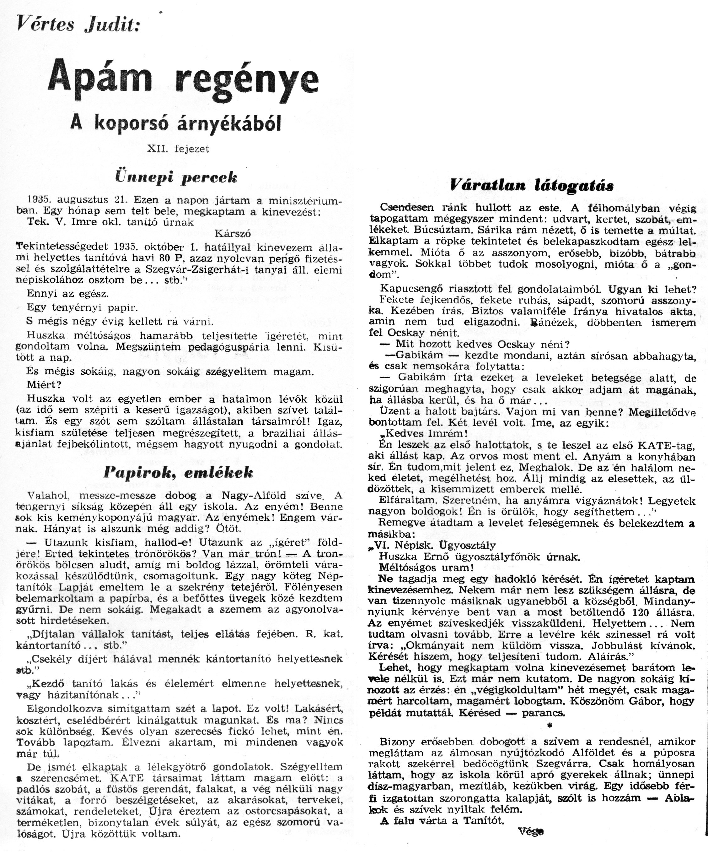 Nyilvános 1125 | 2150 | Zalai Hírlap 1971.03.21. 068sz 08old - Apám regénye 12 | A következő szöveg a cikkből keletkezett automata szövegfelismertető segítségével: Vértes Judit: Apám regénye A koporsó árnyékából XII. fejezet Ünnepi percek 1935. augusztus 21. Ezen a napon jártam a minisztériumban. Egy hónap sem telt bele, megkaptam a kinevezést: Tek. V. Imre oki. tanító úrnak Kárszó Tekintetességedet 1935. október 1. hatállyal kinevezem állami, helyettes tanítóvá havi 80 P, azaz nyolcvan pengő fizetéssel és szolgálattételre a Szegvár-Zsigerhát-i tanyai áll. elemi népiskolához osztom be... stb.\'1 Ennyi az egész. . . Egy tenyérnyi papir. S mégis négy évig kellett ra várni. Huszka méltóságos hamarább teljesítette ígéretet, mint gondoltam volna. Megszűntem pedagóguspária lenni. Kisütött a nap. És mégis sokáig, nagyon sokáig szégyelltem magam. Miért? Huszka volt az egyetlen ember a hatalmon lévók közül (az idő sem szépíti a keserű igazságot), akiben szivet találtam. És egy szót sem szóltam, állástalan társaimról! Igaz, kisfiam születése teljesen megrészegített, a braziliai állásajánlat fejbekólintott, mégsem hagyott nyugodni a gondolat. Papírok, emlékek Valahol, messze-messze dobog a Nagy-Alíöld szive. A tengernyi síkság közepén áll egy iskola. Az enyém! Benne sok. kis keménykoponyájú magyar. Az enyémek! Engem várnak. Hányat is alszunk még addig? ötöt. — Utazunk kisfiam, hallod-e! Utazunk az „ígéret" földjére! Érted tekintetes trónörökös? Van már trón! — A trónörökös bölcsen aludt, amíg mi boldog lázzal, örömteli várakozással készülődtünk, csomagoltunk. Egy nagy köteg Néptanítók Lapját emeltem le a szekrény tetejéről. Fölényesen belemarkoltam a papírba, és a beíőttes üvegek közé kezdtem gyűrni. De nem sokáig. Megakadt a szemem az agyonolvasott hirdetéseken. „Díjtalan vállalok tanítást, teljes ellátás fejében. R. kat. kántortanító ... stb." „Csekély díjért hálával mennék kántortanító helyettesnek «ü>." „Kezdő tanító lakás és élelemért elmenne helyettesnek, vagy házitanitónak ..." Elgondolkozva simitgattam szét a lapot. Ez volt! Lakásért, kosztért, cselédbérért kinálgattuk magunkat. És ma? Nincs sok különbség. Kevés olyan szerecsés fickó lehet, mint én. Tovább lapoztam. Élvezni akartam, mi mindenen vagyok már túl. De ismét elkaptak a lélekgyötrő gondolatok. Szégyelltem • szerencsémet. KATE társaimat láttam magam előtt: ;a padlós szobát, a füstös gerendát, falakat, a vég nélküli nagy vitákat, a forró beszélgetéseket, az akarásokat, terveket, számokat, rendeleteket. Üjra éreztem az ostorcsapásokat, a terméketlen, bizonytalan évek súlyát, az egész szomorú valóságot. Üjra közöttük voltam. Váratlan látogatás Csendesen ránk hullott az este. A félhomályban végig tapogattam mégegyszer mindent: udvart, kertet, szobát, emlékeket. Búcsúztam. Sárika rám nézett, ő is temette a múltat. Elkaptam a röpke tekintetet és belekapaszkodtam egész lel-kemmel. Mióta ő az asszonyom, erősebb, bizóbb, bátrabb vagyok. Sokkal többet tudok mosolyogni, mióta ő a „gondom". Kapucsengő riasztott fel gondolataimból. Ugyan ki lehet? Fekete fejkendős, fekete ruhás, sápadt, szomorú asszonyka. Kezében írás. Biztos valamiféle fránya hivatalos akta. amin nem tud eligazodni. Ránézek, döbbenten ismerem fel Ocskay nénit. — Mit hozott kedves Ocskay néni? —Gabikám — kezdte mondani, aztán sirósan abbahagyta, és csak nemsokára folytatta: — Gabikám írta ezeket a leveleket betegsége alatt, de szigorúan meghagyta, hogy csak akkor adjam át magának, ha állásba kerül, és ha ö már... Üzent a halott bajtárs. Vajon mi van benne? Megilletődve bontottam fel. Két levél volt. Íme, az egyik: ,Kedves Imrém! En leszek az első halottatok, s te leszel az első KATE-tag, aki állást kap. Az orvos most ment el. Anyám a konyhában sir. Én tudom.mit jelent ez. Meghalok. De az én halálom neked életet, megélhetést hoz. Állj mindig az elesettek, az üldözöttek, a kisemmizett emberek mellé. Elfáraltam. Szeretném, ha anyámra vigyáznátok! Legyetek nagyon boldogok! Én is örülök, hogy segíthettem .. .\'• Remegve átadtam a levelet feleségemnek és belekezdtem a másikba: „VI. Népisk. Ügyosztály Huszka Ernő ügyosztályfőnök úrnak. Méltóságos uram! Ne tagadja meg egy hadokló kérését. Én ígéretet kaptam kinevezésemhez. Nekem már nem lesz szükségem állásra, de van tizennyolc másiknak ugyanebből a községből. Mindany-nyiunk kérvénye bent van a most betöltendő 120 állásra. Az enyémet szíveskedjék visszaküldeni. Helyettem ... Nem tudtam olvasni tovább. Erre a levélre kék színessel rá volt írva: „Okmányait nem küldöm vissza. Jobbulást kívánok. Kérését hiszem, hogy teljesíteni tudom. Aláírás." Lehet, hogy megkaptam volna kinevezésemet barátom levele nélkül is. Ezt már nem kutatom. De nagyon sokáig kínozott az érzés: én „végigkoldultam" hét megyét, csak magamért harcoltam, magamért lobogtam. Köszönöm Gábor, hogy példát mutattál. Kérésed — parancs. * Bizony erősebben dobogott a szivem a rendesnél, amikor megláttam az álmosan nyújtózkodó Alföldet és a púposra rakott szekérrel bedöcög\'tünk Szegvárra. Csak homályosan láttam, hogy az iskola körül apró gyerekek állnak; ünnepi dísz-magyarban, mezítláb, kezükben virág. Egy idősebb férfi izgatottan szorongatta kalapját, szólt is hozzám — Ablakok és szívek nyíltak felém. A feht várta a Tanítót. |