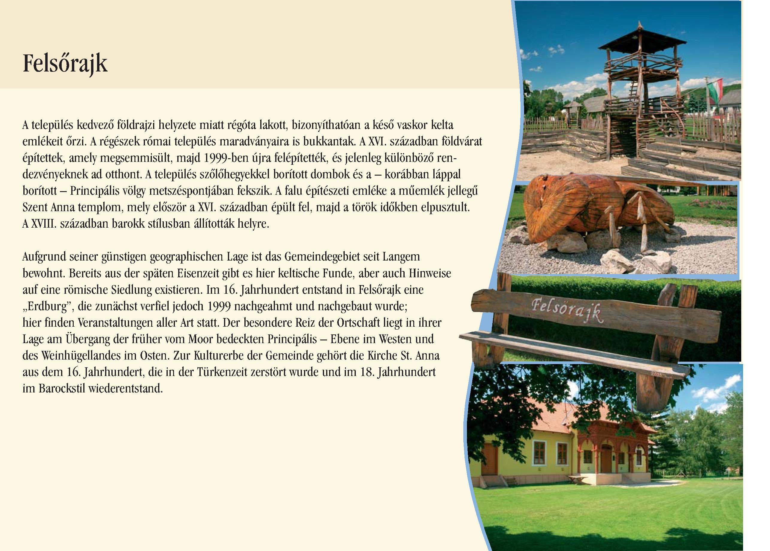 Nyilvános 2739 | 7453 | Felsőrajk | Aufgrund seiner günstigen geographischen Lage ist das Gemeindegebiet seit Langem bewohnt. Bereits aus der späten Eisenzeit gibt es hier keltische Funde, aber auch Hinweise auf eine römische Siedlung existieren. Im 16. Jahrhundert entstand in Felsőrajk eine ,,Erdburg", die zunächst verfiel jedoch 1999 nachgeahmt und nachgebaut wurde; hier finden Veranstaltungen aller Art statt. Der besondere Reiz der Ortschaft liegt in ihrer Lage am Übergang der früher vom Moor bedeckten Principális Ebene im Westen und des Weinhügellandes im Osten. Zur Kulturerbe der Gemeinde gehört die Kirche St. Anna aus dem 16. Jahrhundert, die in der Türkenzeit zerstört wurde und im 18. Jahrhundert im Barockstil wiederentstand. Dieses Text stammt von: Pannonhát tájpark prospektus 2006. Web: http://www.pannonhat.hu/ (auch in Deutsch) |