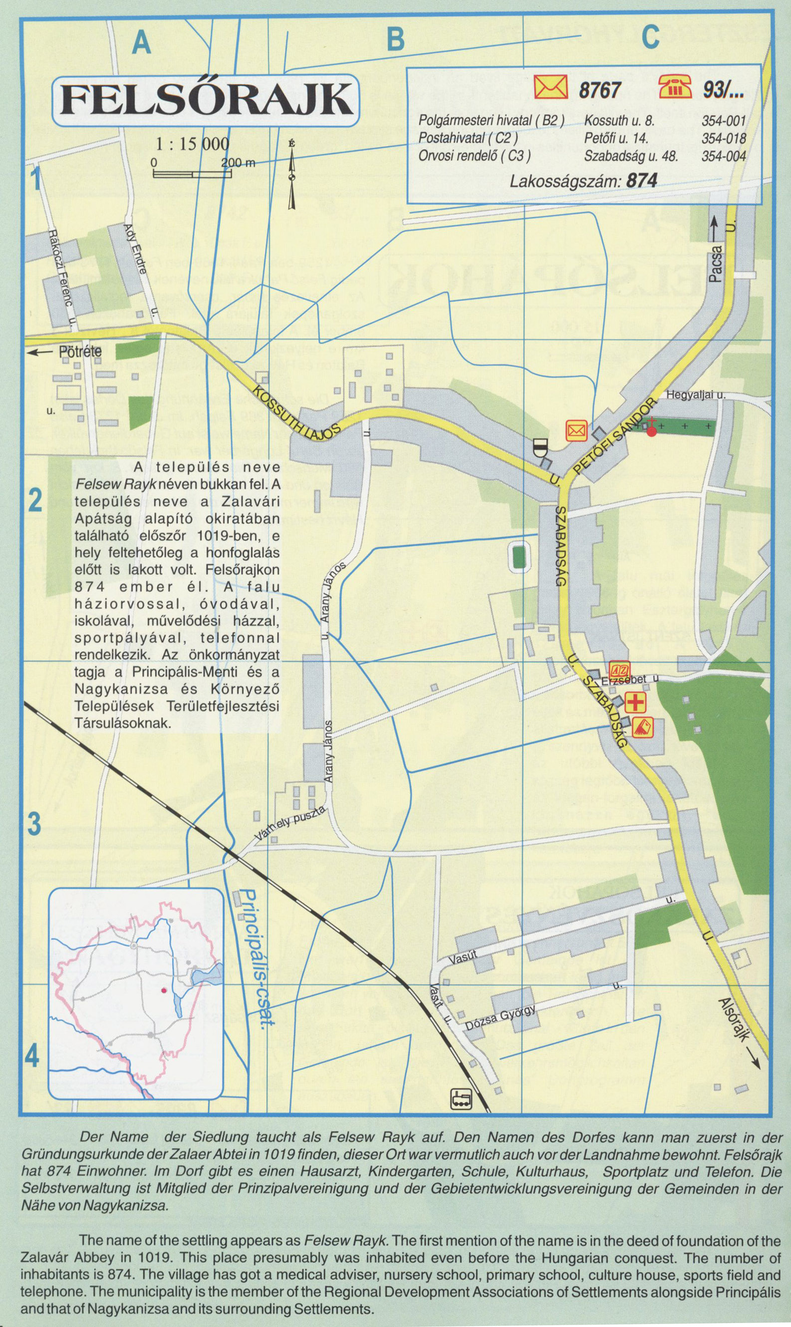 Nyilvános 2717 | 8505 | Felsőrajk | A település neveFelsew Rayknéven bukkan fel. A település neve a Zalavári Apátság alapító okiratában található először 1019-ben, e hely feltehetőleg a honfoglalás előtt is lakott volt. Felsőrajkon 874 ember él. A falu háziorvossal, óvodával, iskolával, művelődési házzal, sportpályával, telefonnal.rendelkezik. Az önkormányzat tagja a Principális-Menti és a Nagykanizsa és Környező Települések Területfejlesztési Társulásoknak. Der Name der Siedlung taucht als Felsew Rayk auf. Den Namen des Dorfes kann man zuerst in der Gründungsurkunde der Zalaer Abtei in 1019 finden, dieser Ort war vermutlich auch vor der Landnahme bewohnt. Felsőrajk hat 874 Einwohner. Im Dorf gibt es einen Hausarzt, Kindergarten, Schule, Kulturhaus, Sportplatz und Telefon. Die Selbstverwaltung ist Mitglied der Prinzipalvereinigung und der Gebietentwicklungsvereinigung der Gemeinden in der Nähe von Nagykanizsa. The name of the settling appears as Felsew Rayk. The first mention of the name is in the deed of foundation of the Zalavár Abbey in 1019. This place presumably was inhabited even before the Hungarian conquest. The number of inhabitants is 874. The village has got a medical adviser, nursery school, primary school, culture house, sports field and telephone. The municipality is the member of the Regional Development Associations of Settlements alongside Principális and that of Nagykanizsa and its surrounding Settlements. A részlet a következő kiadványból származik/Die Teile stammen vom volgenden Buch/This text came from the following book: Cím/Titel/Title: Zala megye településeinek atlasza - 257 település részletes térképe/Atlas der Komitat Zala - 257 Detailte Siedlungskarten/Zala county\'s Atlas - 257 settlement maps. Közreműködő/contributor: Lackner László (1943) (fotó) Kiadás/Ausgabe/Publisher: Gyula : HISZI-MAP, 1997 Sorozat/Serie/Series: Indulástól - megérkezésig... ETO: 912(439.121-2) ; 908.439.121 Cutter: Z 19 ISBN: 963-610-025-4 Oldalszám/Seiten/Pages: 323, 81 p. Megjegyzés/Note: Lezárva/Abgeschlossen am/Closed am: 1997. máj. 30. |