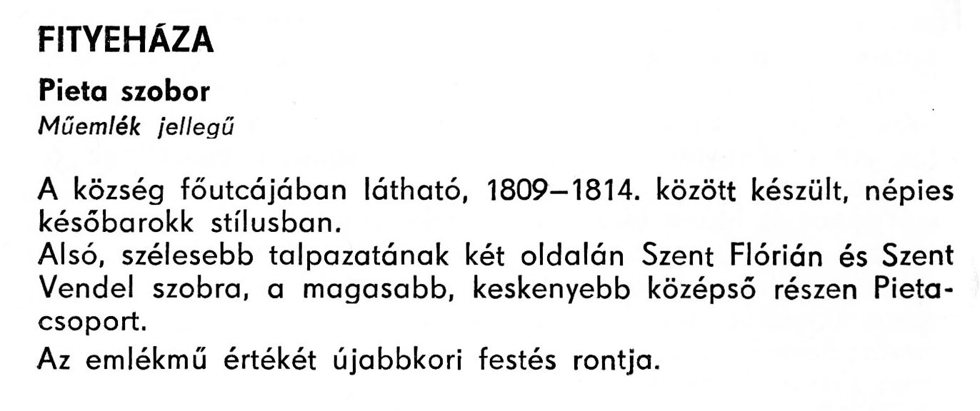 Nyilvános 2611 | 6952 | Fityeháza - Zala megye műemlékei 1977 056old | A részlet szövege: FITYEHÁZA Pieta szobor Műemlék jellegű A község főutcájában látható, 1809-1814. között készült, népies későbarokk stílusban. Alsó, szélesebb talpazatának két oldalán Szent Flórián és Szent Vendel szobra, a magasabb, keskenyebb középső részen Pieta-csoport. Az emlékmű értékét újabbkori festés rontja. A részlet a következő könyvből származik: Cím: Zala megye műemlékei Szerző: Németh József (1928) Közreműködő: Lantos Miklós (fotó) Szerz. közl.: Németh József ; [fotók... Lantos Miklós] Kiadás: Zalaegerszeg : Zalai Ny., 1977 ETO jelzet: 72(439.121) ; 7.025.3/.4 ; 908.439.121 Tárgyszó: Zala megye Szakjelzet: 908 Cutter: N 53 Nyelv: magyar Oldalszám: 109 p. |