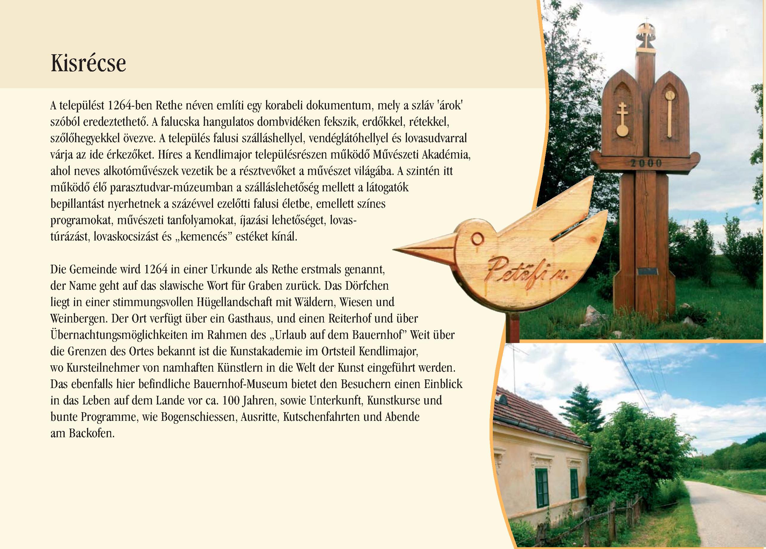 Nyilvános 2140 | 6243 | Rövid leírás | Teljes leírás (1 KB) | Kisrécse Die Gemeinde wird 1264 in einer Urkunde als Rethe erstmals genannt, der Name geht auf das slawische Wort für Graben zurück. Das Dörfchen liegt in einer stimmungsvollen Hügellandschaft mit Wäldern, Wiesen und Weinbergen. Der Ort verfügt über ein Gasthaus, und einen Reiterhof und über Übernachtungsmöglichkeiten im Rahmen des ,,Urlaub auf dem Bauernhof" Weit über die Grenzen des Ortes bekannt ist die Kunstakademie im Ortsteil Kendlimajor, wo Kursteilnehmer von namhaften Künstlern in die Welt der Kunst eingeführt werden. Das ebenfalls hier befindliche Bauernhof-Museum bietet den Besuchern einen Einblick in das Leben auf dem Lande vor ca. 100 Jahren, sowie Unterkunft, Kunstkurse und bunte Programme, wie Bogenschiessen, Ausritte, Kutschenfahrten und Abende am Backofen. Dieses Text stammt von: Pannonhát tájpark prospektus 2006. Web: http://www.pannonhat.hu/ (auch in Deutsch) |