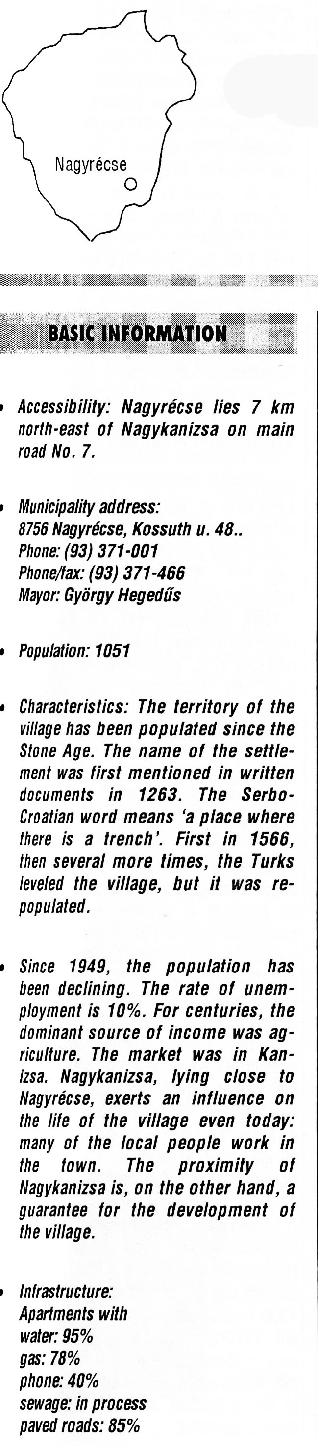 Nyilvános 2250 | 5777 | Nagyrécse | BASIC INFORMATION Accessibility: Nagyrécse lies 7 km north-east of Nagykanizsa on main road No. 7. Municipality address: 8756 Nagyrécse, Kossuth u. 48. Phone: (93) 371-001 Phone/fax: (93) 371-466 Mayor: György Hegedűs Population: 1051 Characteristics: The territory of the village has been populated since the Stone Age. The name of the settlement was first mentioned in written documents in 1263. The Serbo-Croatian word means \'a place where there is a trench\'. First in 1566, then several more times, the Turks leveled the village, but it was re-populated. Since 1949, the population has been declining. The rate of unemployment is 10%. For centuries, the dominant source of income was agriculture. The market was in Kanizsa. Nagykanizsa, lying close to Nagyrécse, exerts an influence on the life of the village even today: many of the local people work in the town. The proximity of Nagykanizsa is, on the other hand, a guarantee for the development of the village. Infrastructure: Apartments with water: 95% gas: 78% phone: 40% sewage: in process paved roads: 85% This text came from the following book: Title: Handbook of Zala county (Zala megye kézikönyve) Series: County handbooks of Hungary (Magyarország megyei kézikönyvei) Chief editor: Hóbor József Publisher: (Hatvan), CEBA-Hungary Ltd, 1998 ETO: 908.439.121(035) ; 050.8(439.121) ISBN: 963-9089-18-2 Pages: 488-1040 p. Remark: Closed on: 1998. márc. 31. |