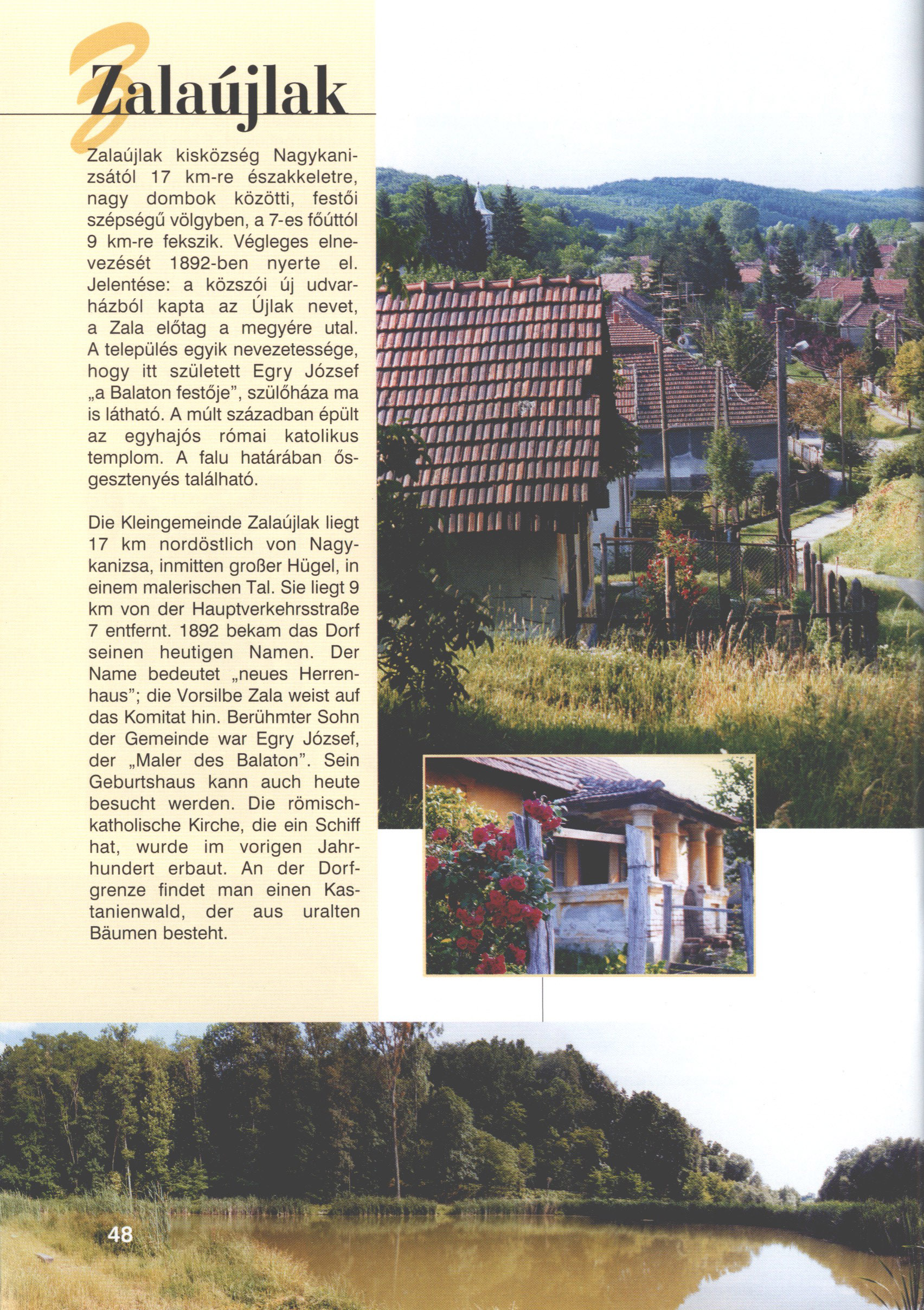Nyilvános 2103 | 5795 | Zalaújlak | Die Kleingemeinde Zalaújlak liegt 17 km nordöstlich von Nagykanizsa, inmitten großer Hügel, in einem malerischen Tal. Sie liegt 9 km von der Hauptverkehrsstraße 7 entfernt. 1892 bekam das Dorf seinen heutigen Namen. Der Name bedeutet „neues Herrenhaus"; die Vorsilbe Zala weist auf das Komitat hin. Berühmter Sohn der Gemeinde war Egry József, der „Maler des Balaton". Sein Geburtshaus kann auch heute besucht werden. Die römischkatholische Kirche, die ein Schiff hat, wurde im vorigen Jahrhundert erbaut. An der Dorfgrenze findet man einen Kastanienwald, der aus uralten Bäumen besteht. Dieses Text stammt von: Titel: Hívogató a Régiók Kapujában - Útikönyv Látnivalók Nagykanizsán és Térségében (Einladend in dem Tor des Gebiets - Reisebuch - Sehenswürdigkeiten in Nagykanizsa und Umgebung) Herausgegeben von: Nagykanizsa és a Környező Települések Területfejlesztési Társulása (Verein für Gebietsentwicklung in Nagykanizsa und in ihrer Umgebung) 8800 Nagykanizsa, Petőfi Sándor út 5. Tel.: 06 93/536-453 • 06 93/536-454 Tel ./Fax: 06 93/326-323 E-mail: terstars@axelero.hu www.kanizsaterseg.celodin.hu |