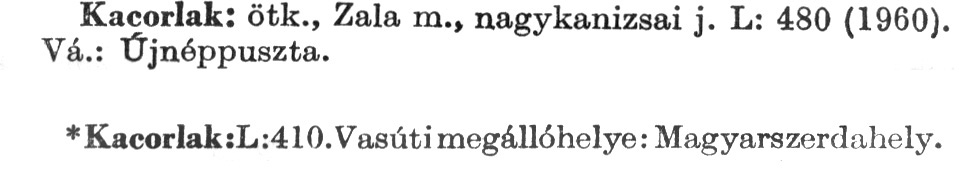 Nyilvános 2406 | 6523 | Rövid leírás | Teljes leírás (996 B) | A szócikkek felismertetett szövege: (A csillag után az 1972-es kiadású kiegészítő kötetből származó szöveg következik) Kacorlak: ötk., Zala m., nagykanizsai j. L: 480 (1960). Vá.: Újnéppuszta. *Kacorlak: L: 410. Vasúti megállóhelye: Magyarszerdahely. A szócikkek a következő lexikonból származnak: Cím: Új magyar lexikon Közreműködő: Berei Andor (1900-1979) (szerk.) Szerz. közl.: [szerk. Berei Andor et al.] Kiadás jelzés: 2. lny. Kiadás: Budapest : Akad. K., 1961-1962 Kötetei: 1., A - C 2., D - F 3., G - J 4., K - Me 5., Mf - R 6., S - Z 7. köt., A-Z Kiegészítő kötet (1972) Kiegészítő kötet, 1962÷1980 (1981) ETO jelzet: 03=945.11 Szakjelzet: 030 Cutter: U 28 Nyelv: magyar Megjegyzés: Bibliogr. a címszavak egy részének végén |