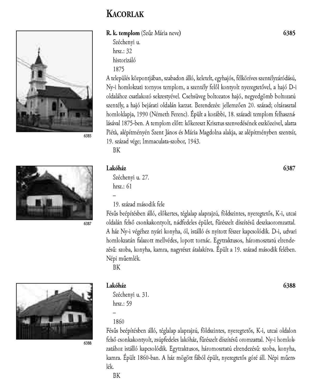 Nyilvános 2102 | 4645 | Kacorlak - Magyarország műemlékjegyzéke - Zala megye 2006 036old | A részlet szövege: KACORLAK R. k. templom (Szűz Mária neve) 6385 Széchenyi u. hrsz.: 32 historizáló 1875 A település központjában, szabadon álló, keletelt, egyhajós, félköríves szentélyzáródású, Ny-i homlokzati tornyos templom, a szentély felől kontyolt nyeregtetővel, a hajó D-i oldalához csatlakozó sekrestyével. Csehsüveg boltozatos hajó, negyedgömb boltozatú szentély, a hajó bejárati oldalán karzat. Berendezés: jellemzően 20. század; oltárasztal homloklapja, 1990 (Németh Ferenc). Épült a korábbi, 18. századi templom felhasználásával 1875-ben. A templom előtt: kőkereszt Krisztus szenvedésének eszközeivel, alatta Piétà, alépítményén Szent János és Mária Magdolna alakja, az alépítményben szentsír, 19. század vége; Immaculata-szobor, 1943. BK Lakóház 6387 Széchenyi u. 27. hrsz.: 61 – 19. század második fele Fésűs beépítésben álló, előkertes, téglalap alaprajzú, földszintes, nyeregtetős, K-i, utcai oldalán felső csonkakontyolt, nádfedeles épület, fűrészelt díszítésű deszkaoromzattal. A ház Ny-i végéhez nyári konyha, ól, istálló és nyitott fészer kapcsolódik. D-i, udvari homlokzatán falazott mellvédes, lopott tornác. Egytraktusos, háromosztatú elrendezésű: szoba, konyha, kamra, nagyrészt átalakítva. Épült a 19. század második felében. Népi műemlék. BK Lakóház 6388 Széchenyi u. 31. hrsz.: 59 – 1860 Fésűs beépítésben álló, téglalap alaprajzú, földszintes, nyeregtetős, K-i, utcai oldalon felső csonkakontyolt, zsúpfedeles lakóház, fűrészelt díszítésű oromzattal. Ny-i homlokzatához istálló kapcsolódik. Egytraktusos, háromosztatú elrendezésű: szoba, konyha, kamra. Épült 1860-ban. A ház mögött fából épült, nyeregtetős góré áll. Népi műemlék. BK A részlet a következő könyv online változatából származik: Cím: Magyarország műemlékjegyzéke Közreműködő: Haris Andrea. (szerk.) ; Kulturális Örökségvédelmi Hivatal (Budapest) (közread.) ; Somorjay Sélysette. (szerk.) ; Bardoly István (közrem.) Szerz. közl.: [sorozatszerk. Haris Andrea, Somorjay Sélysette] ; [mtárs Bardoly István] ; [közread. a] Kulturális Örökségvédelmi Hivatal. Kiadás: Budapest : KÖH, 2006 Kötetadat: Zala megye ISBN: 963-86510-7-5 ö ISBN: 963 7474 10 2 Nyelv: magyar A jegyzék a Kultúrális Örökségvédelmi Hivatal honlapján, a következő link alatt található: http://www.koh.hu/index.php?_mp=nyitolap&_amp=MUEML A fejléc adatairól 1. Objektum neve – törzsszám A fejléc első sora a műemlék eredeti rendeltetésének megfelelő nevet tartalmazza. Mögötte zárójelben templom esetében annak titulusa, más épületeknél indokolt esetben az eredeti rendeltetéstől eltérő, mai használatra utaló intézmény név (pl. városháza, múzeum, szálloda, oktatási intézmény hivatalos neve, stb.) olvasható. A törzsszám (trsz.) a műemlék egyetlen soha nem változó adata. A gyors azonosítás, illetve a törzsszám szerinti keresés lehetősége végett az objektummal egy sorban, a fejléc jobb szélén kiemelten jelenik meg. Összetartozó műemlék részek vagy történetileg egy együttest alkotó műemlékek sokszor külön törzsszámon lettek műemlékké nyilvánítva. Előfordulhat ezért, hogy egy fejléc alatt a leíró részben több, külön törzsszámmal rendelkező objektum szerepel. A törzsszámot ezekben az esetekben is az objektummal egy sorban tüntetjük fel. 2. Utca, házszám Egy utcán belül, amennyiben a számozás ezt lehetővé teszi, először a templomot adjuk meg, ezt követi a parókia, majd egyéb objektumok, pl. szobrok következnek. Házszám nélkül említünk egyes műemlékfajtákat (elsősorban templomokat), amennyiben a topográfiai azonosítás szempontjából a házszám közömbös vagy éppen zavaró. Előfordul, hogy a műemlék nem köthető nevesített közterülethez. Az ilyeneket a település végéhez soroltuk, és a leírásban kitértünk a településen belül elfoglalt helyükre. 3. Helyrajzi szám Ha egy helyrajzi számon és egy címen (pl. temetőben) több, külön törzsszámmal védett objektum van, akkor az együttesre utaló műemlék megnevezés alatt a közös adatokat egyszer adjuk meg. Ezt követően külön címszavanként következik a műemlékek leírása. Ilyen esetben az emlékeket mutatóztuk. Ezt az eljárást követtük, tekintet nélkül arra, hogy a teljes együttes védett-e vagy sem. (Védett együttes mellett mindig törzsszám szerepel.) Ha több helyrajzi szám is tartozik egy törzsszámhoz, akkor a fejlécben valamennyi számot feltüntettük. Amennyiben ilyen esetben több elemből álló műemlékről van szó, akkor a leíró részben minden külön említett elem után zárójelben megadjuk a vonatkozó helyrajzi számot. 4. Stílus A műemléket jelenleg meghatározó, domináns stílusjegy alapján került meghatározásra. Egyéb, érzékelhető stíluselemekre a leíró részben utalunk. 5. Datálás A műemléket jelenleg leginkább jellemző építési dátum. Korábbi építési periódusokra, illetve későbbi átépítésekre a történeti részben utalunk, fennmaradt részletek esetén lehetőség szerint azokra vonatkoztatva. A leírás A műemlékek leírása tartalmilag öt szakaszból áll, amely folyamatos szövegként jelenik meg. Az objektum topográfiai meghatározása a műemlék településen belüli vagy ahhoz viszonyított helyét adja meg, amennyiben ez az azonosításhoz nélkülözhetetlen, avagy azt segíti. Az emlék jellegének leírása utal a környezettel való kapcsolatra (tájolás, beépítés módja, környező terepviszonyok, amennyiben ezek jellemzőek), alaprajzi elrendezésre, tömegre és a jellegzetes homlokzati elemekre (pl. rizalitok, erkélyek, stb.). Részletes homlokzatleírás nem v