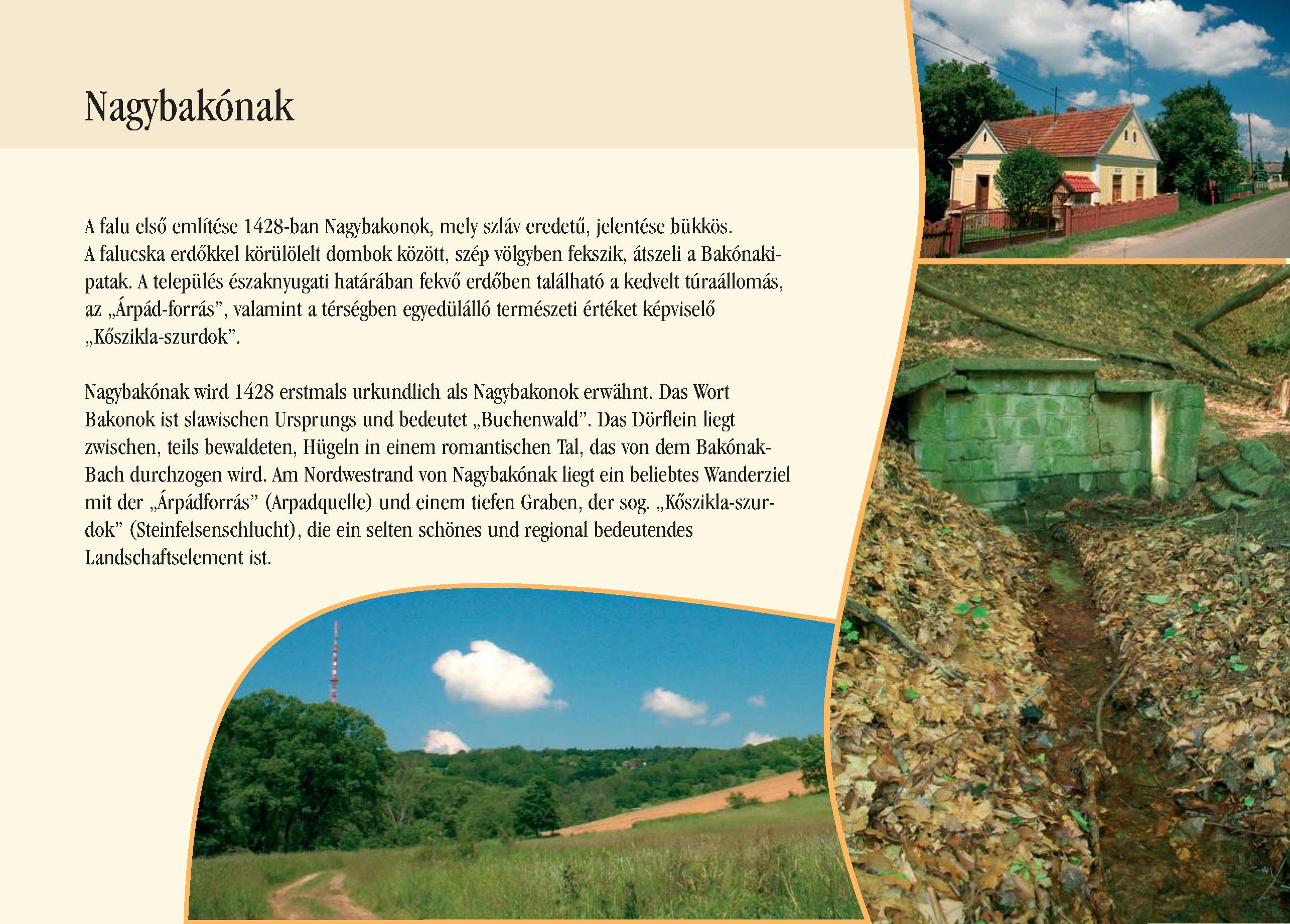 Nyilvános 3097 | 10788 | Nagybakónak | Nagybakónak wird 1428 erstmals urkundlich als Nagybakonok erwähnt. Das Wort Bakonok ist slawischen Ursprungs und bedeutet ,,Buchenwald". Das Dörflein liegt zwischen, teils bewaldeten, Hügeln in einem romantischen Tal, das von dem Bakónak-Bach durchzogen wird. Am Nordwestrand von Nagybakónak liegt ein beliebtes Wanderziel mit der ,,Árpádforrás" (Arpadquelle) und einem tiefen Graben, der sog. ,,Kőszikla-szurdok" (Steinfelsenschlucht), die ein selten schönes und regional bedeutendes Landschaftselement ist. Dieses Text stammt von: Pannonhát tájpark prospektus 2006. Web: http://www.pannonhat.hu/ (auch in Deutsch) |