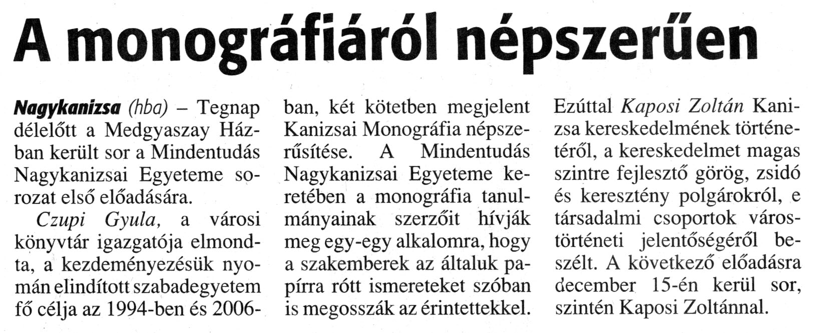 Nyilvános 2943 | 5253 | Zalai Hírlap 2008. november 18. 269. szám 3. oldal - A monográfiáról népszerűen | A cikk szövege: A monográfiáról népszerűen Nagykanizsa (hba) - Tegnap délelőtt a Medgyaszay Házban került sor a Mindentudás Nagykanizsai Egyeteme sorozat első előadására. Czupi Gyula, a városi könyvtár igazgatója elmondta, a kezdeményezésük nyomán elindított szabadegyetem fő célja az 1994-ben és 2006-ban, két kötetben megjelent Kanizsai Monográfia népszerűsítése. A Mindentudás Nagykanizsai Egyeteme keretében a monográfia tanulmányainak szerzőit hívják meg egy-egy alkalomra, hogy a szakemberek az általuk papírra rótt ismereteket szóban is megosszák az érintettekkel. Ezúttal Kaposi Zoltán Kanizsa kereskedelmének történetéről, a kereskedelmet magas szintre fejlesztő görög, zsidó és keresztény polgárokról, e társadalmi csoportok várostörténeti jelentőségéről beszélt. A következő előadásra december 15-én kerül sor, szintén Kaposi Zoltánnal. |