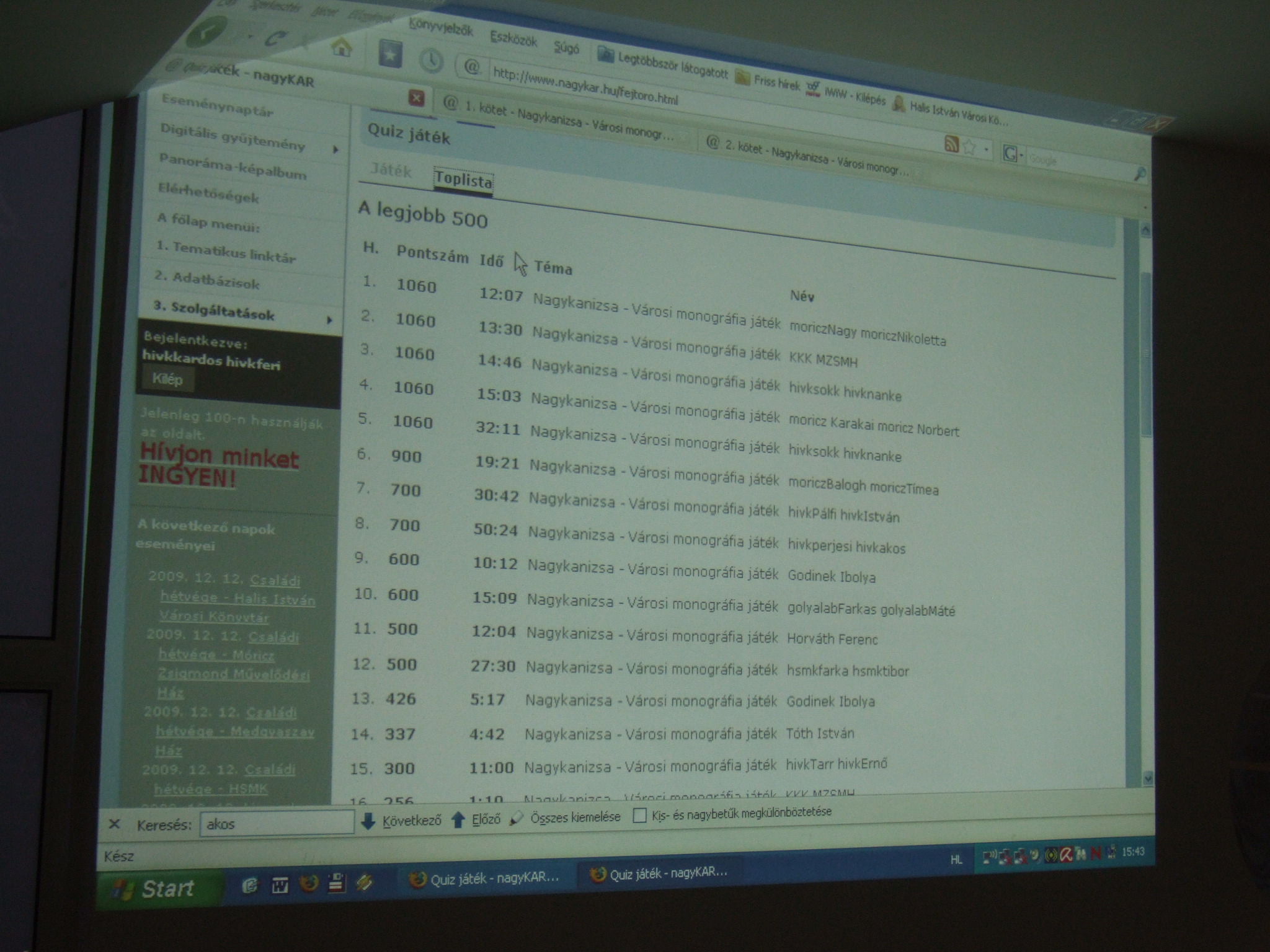 2009.12.12. 14.00 - Családi Hétvége - Internetes kvízjáték a Nagykanizsa monográfia anyagából