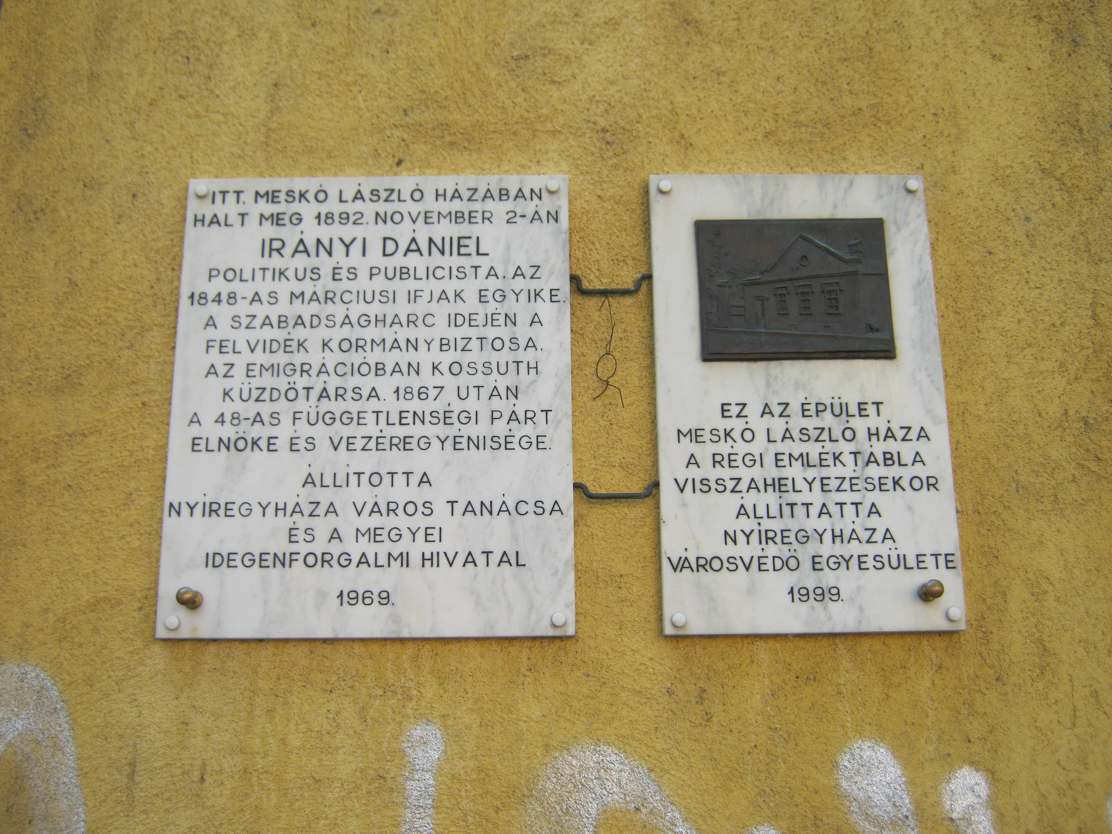 Nyilvános 1009 | 1361 | Nyíregyháza, Dózsa György utca 14. | Az itt álló, valamikor 1969 után lebontott régi, ún. Meskó-házban hunyt el 1892. november 2-án Irányi Dániel politikus, publicista. Az eredeti házat jelölő emléktáblát utódán is elhelyezték egy kiegészítő táblával együtt, amelyen látható a Meskó-ház korabeli képe. A fénykép 2010 augusztus elején készült. |