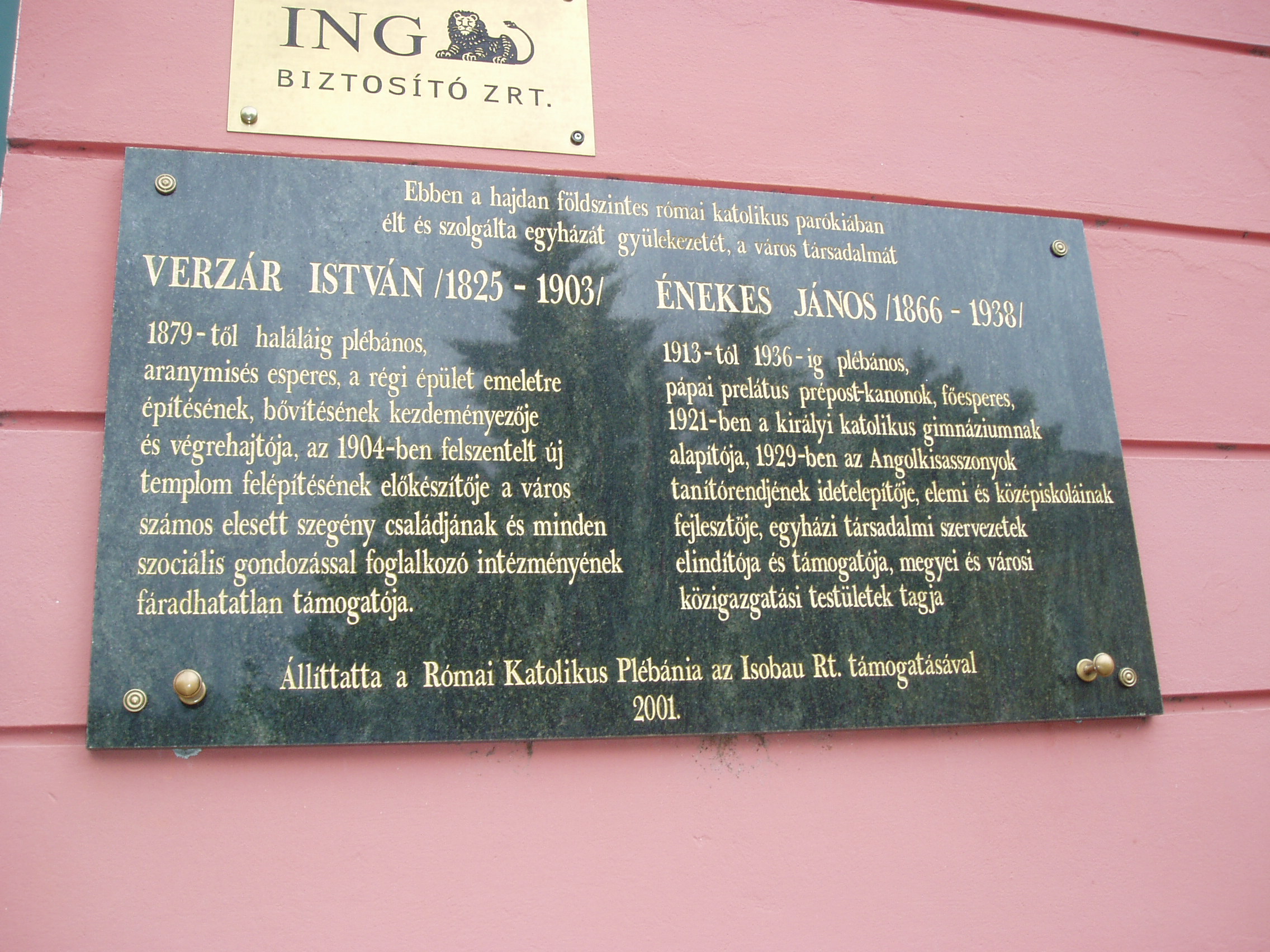 A római katolikus parókia falán két jeles plébános, Énekes János és Verzár István emlékét őrzi a fekete márványtábla.