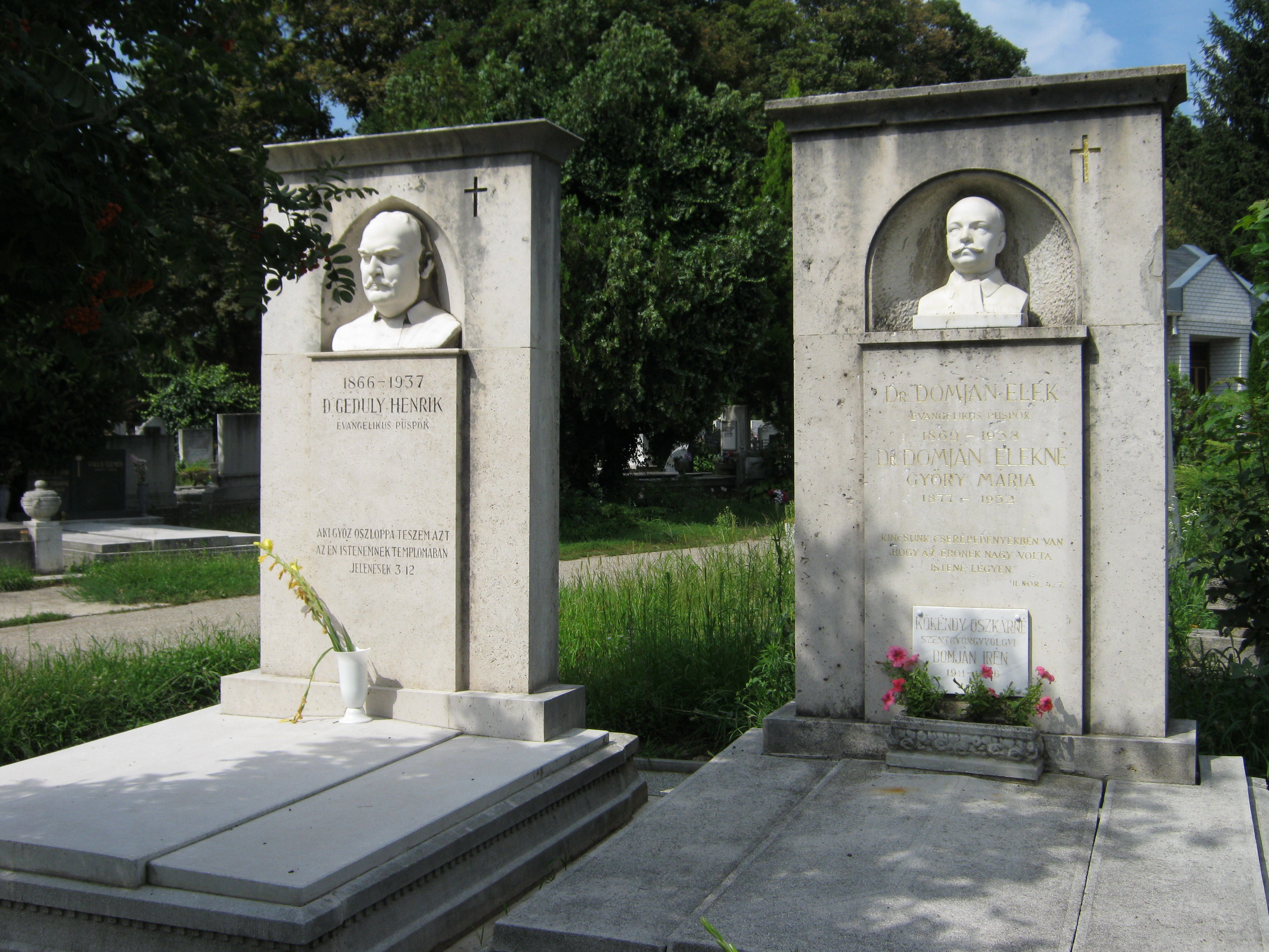 Nyilvános 1057 | 3049 | Nyíregyháza, Pazonyi tér, Északi temető: Geduly Henrik és Domján Elek | A Dózsa György út vezet Nyíregyháza Északi temetőjébe. A ravatalozó mögötti díszsírhelyen nyugszik Nyíregyháza két kiváló személyisége, evangélikus püspöke, dr. Geduly Henrik (1866-1937) és dr. Domján Elek (1869-1928). Felh. irod.: Fazekas Árpád - Szekrényes András: Nyíregyháza temetői. Nyíregyháza, 1990 A fénykép 2010 augusztus elején készült |