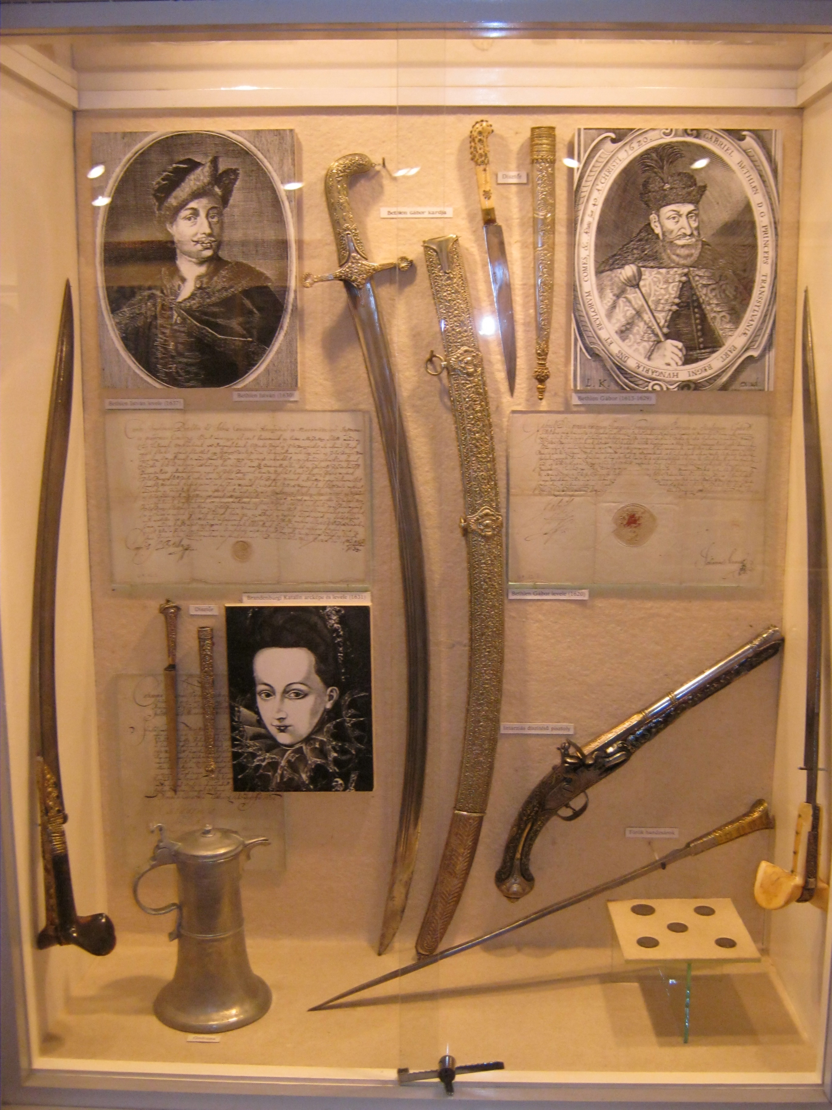 Nyilvános 960 | 1315 | Nyírbátor, Károlyi utca 21. Báthori István Múzeum | A minorita kolostor épültét 1959-ben kapta meg a múzeum. Első igazgatója, Szalontai Barnabás áldozatos munkája nyomán két év múlva már meg is nyílhatott benne az első kiállítás. A képen Bethlen Gábor relikviái: középen kardja, jobbra egy 1620-ból származó levele, balra pedig második felesége, Brandenburgi Katalin 1631-ben írott levele, alatta arcképével. Felh. irod.: Látnivalók Szabolcs-Szatmár-Bereg megyében. Miskolc, Well-PRess, 1999 www.nyirbim.hu |
