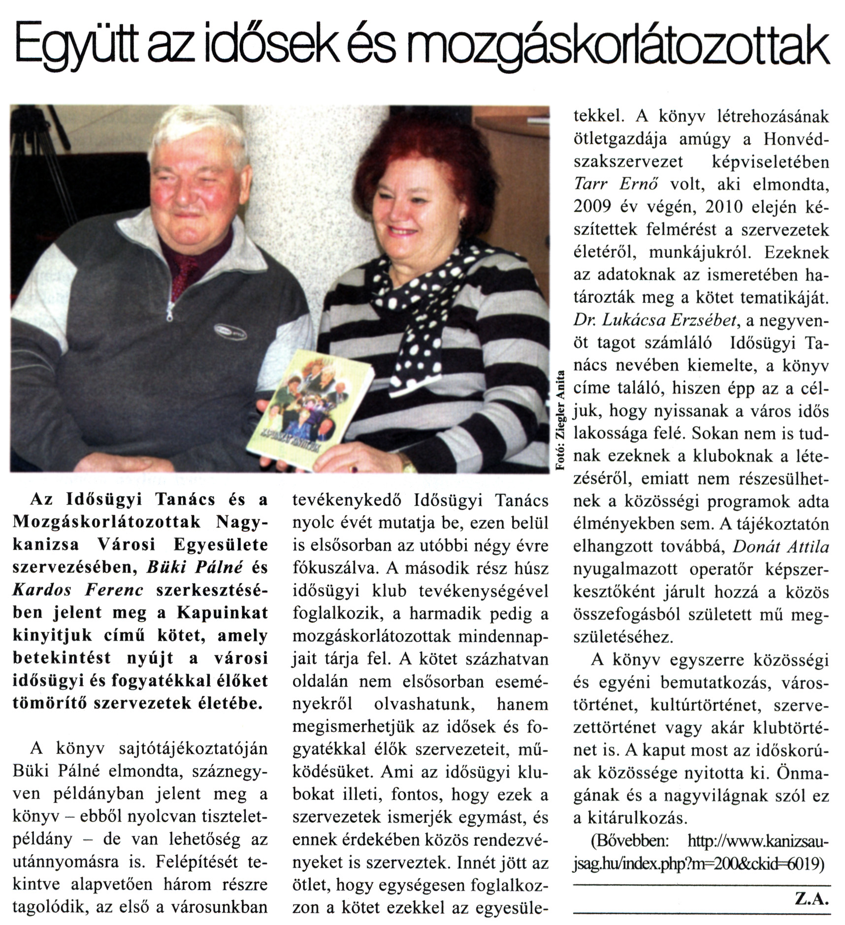 Nyilvános 2452 | 7602 | Rövid leírás | Teljes leírás (2.64 KB) | Kanizsa 2011. január 20. 2. szám 5. oldal - Együtt az idősek és mozgáskorlátozottak A cikk szövege: Együtt az idősek és mozgáskorlátozottak Az Idősügyi Tanács és a Mozgáskorlátozottak Nagykanizsa Városi Egyesülete szervezésében, Büki Pálné és Kardos Ferenc szerkesztésében jelent meg a Kapuinkat kinyitjuk című kötet, amely betekintést nyújt a városi idősügyi és fogyatékkal élőket tömörítő szervezetek életébe. A könyv sajtótájékoztatóján Büki Pálné elmondta, száznegyven példányban jelent meg a könyv - ebből nyolcvan tiszteletpéldány - de van lehetőség az utánnyomásra is. Felépítését tekintve alapvetően három részre tagolódik, az első a városunkban tevékenykedő Idősügyi Tanács nyolc évét mutatja be, ezen belül is elsősorban az utóbbi négy évre fókuszálva. A második rész húsz idősügyi klub tevékenységével foglalkozik, a harmadik pedig a mozgáskorlátozottak mindennapjait tárja fel. A kötet százhatvan oldalán nem elsősorban eseményekről olvashatunk, hanem megismerhetjük az idősek és fogyatékkal élők szervezeteit, működésüket. Ami az idősügyi klubokat illeti, fontos, hogy ezek a szervezetek ismerjék egymást, és ennek érdekében közös rendezvényeket is szerveztek. Innét jött az ötlet, hogy egységesen foglalkozzon a kötet ezekkel az egyesületekkel. A könyv létrehozásának ötletgazdája amúgy a Honvédszakszervezet képviseletében Tarr Ernő volt, aki elmondta, 2009 év végén, 2010 elején készítettek felmérést a szervezetek életéről, munkájukról. Ezeknek az adatoknak az ismeretében határozták meg a kötet tematikáját. Dr. Lukácsa Erzsébet, a negyvenöt tagot számláló Idősügyi Tanács nevében kiemelte, a könyv címe találó, hiszen épp az a céljuk, hogy nyissanak a város idős lakossága felé. Sokan nem is tudnak ezeknek a kluboknak a létezéséről, emiatt nem részesülhetnek a közösségi programok adta élményekben sem. A tájékoztatón elhangzott továbbá, Donát Attila nyugalmazott operatőr képszerkesztőként járult hozzá a közös összefogásból született mű megszületéséhez. A könyv egyszerre közösségi és egyéni bemutatkozás, várostörténet, kultúrtörténet, szervezettörténet vagy akár klubtörténet is. A kaput most az időskorúak közössége nyitotta ki. Önmagának és a nagyvilágnak szól ez a kitárulkozás. (Bővebben: http://www.kanizsaujsag.hu/index.php?m=200&ckid=6019) Z.A. Fotó: Ziegler Anita |