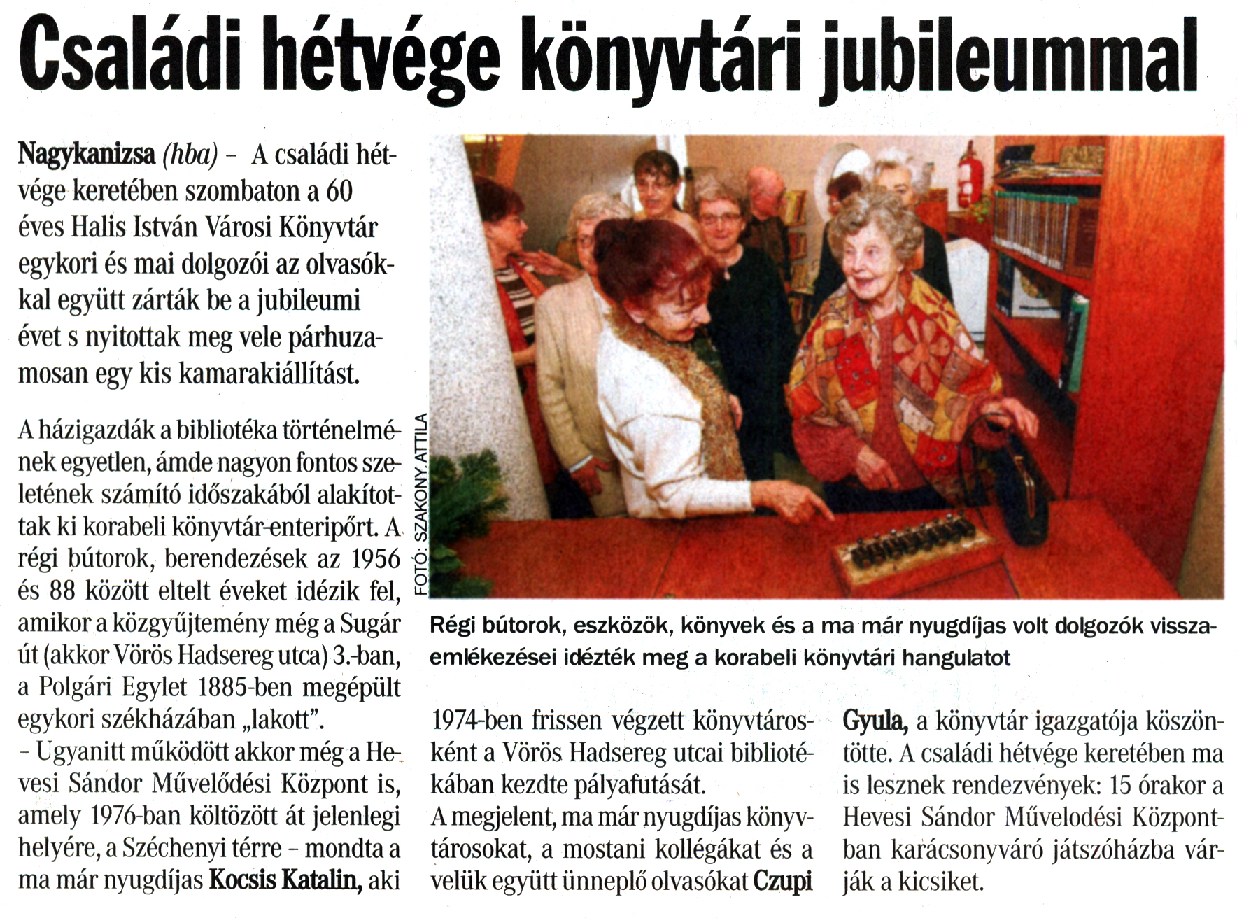 Nyilvános 1822 | 5927 | Vasárnapi Zalai Hírlap 2011. december 11. 48. szám 1. oldal - Családi hétvége könyvtári jubileummal | Családi hétvége könyvtári jubileummal Nagykanizsa (hba) - A családi hétvége keretében szombaton a 60 éves Halis István Városi Könyvtár egykori és mai dolgozói az olvasókkal együtt zárták be a jubileumi évet s nyitottak meg vele párhuzamosan egy kis kamarakiállítást. A házigazdák a bibliotéka történelmének egyetlen, ámde nagyon fontos szeletének számító időszakából alakítottak ki korabeli könyvtár-enteripőrt. A régi bútorok, berendezések az 1956 és 88 között eltelt éveket idézik fel, amikor a közgyűjtemény még a Sugár út (akkor Vörös Hadsereg utca) 3.-ban, a Polgári Egylet 1885-ben megépült egykori székházában „lakott". - Ugyanitt működött akkor még a Hevesi Sándor Művelődési Központ is, amely 1976-ban költözött át jelenlegi helyére, a Széchenyi térre - mondta a ma már nyugdíjas Kocsis Katalin, aki 1974-ben frissen végzett könyvtárosként a Vörös Hadsereg utcai bibliotékában kezdte pályafutását. A megjelent, ma már nyugdíjas könyvtárosokat, a mostani kollégákat és a velük együtt ünneplő olvasókat Czupi Gyula, a könyvtár igazgatója köszöntötte. A családi hétvége keretében ma is lesznek rendezvények: 15 órakor a Hevesi Sándor Művelődési Központban karácsonyváró játszóházba várják a kicsiket. Régi bútorok, eszközök, könyvek és a ma már nyugdíjas volt dolgozók visszaemlékezései idézték meg a korabeli könyvtári hangulatot |