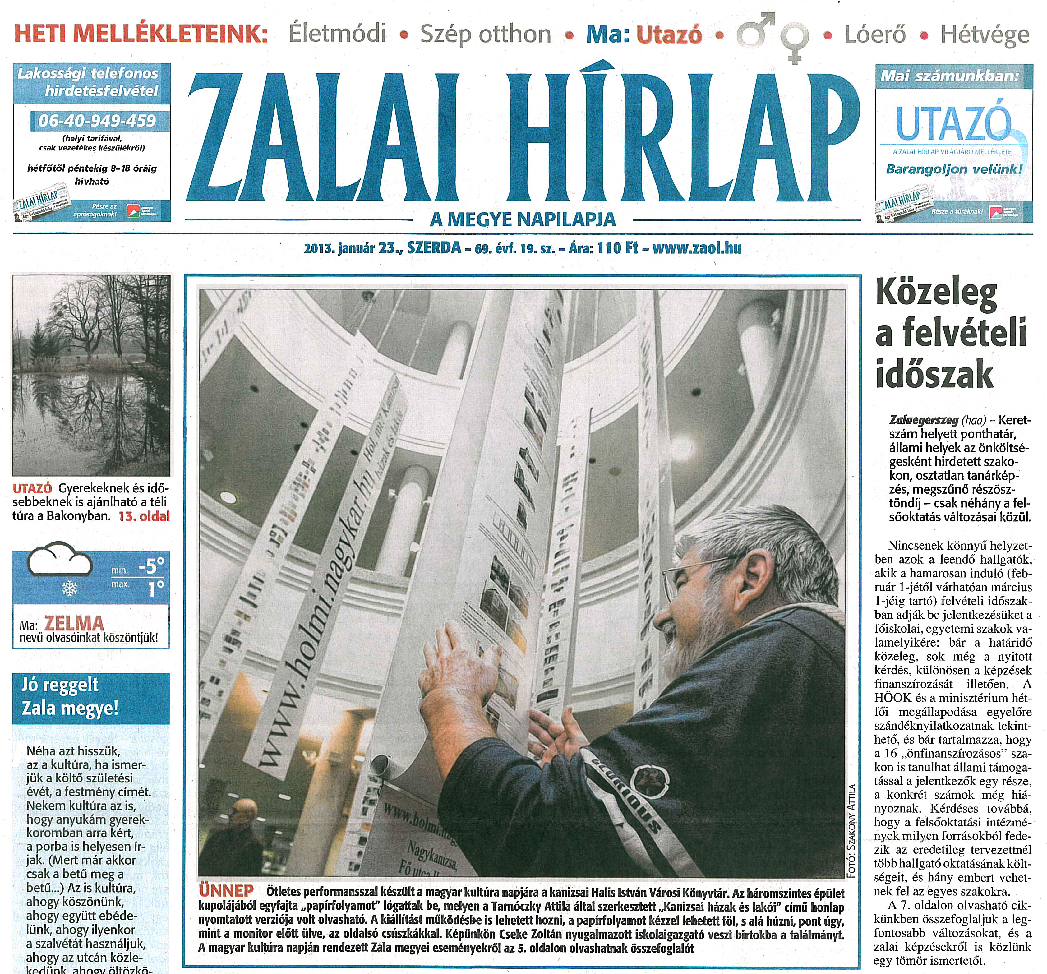 Nyilvános 1742 | 5251 | Zalai Hírlap 2013. január 23. 19. szám 1. oldal - Ünnep | ÜNNEP Ötletes performansszal készült a magyar kultúra napjára a kanizsai Halis István Városi Könyvtár. Az háromszintes épület kupolájából egyfajta „papírfolyamot" lógattak be, melyen a Tarnóczky Attila által szerkesztett „Kanizsai házak és lakói" című honlap nyomtatott verziója volt olvasható. A kiállítást működésbe is lehetett hozni, a papírfolyamot kézzel lehetett föl, s alá húzni, pont úgy, mint a monitor előtt ülve, az oldalsó csúszkákkal. Képünkön Cseke Zoltán nyugalmazott iskolaigazgató veszi birtokba a találmányt. A magyar kultúra napján rendezett Zala megyei eseményekről az 5. oldalon olvashatnak összefoglalót Fotó: Szakony Attila |