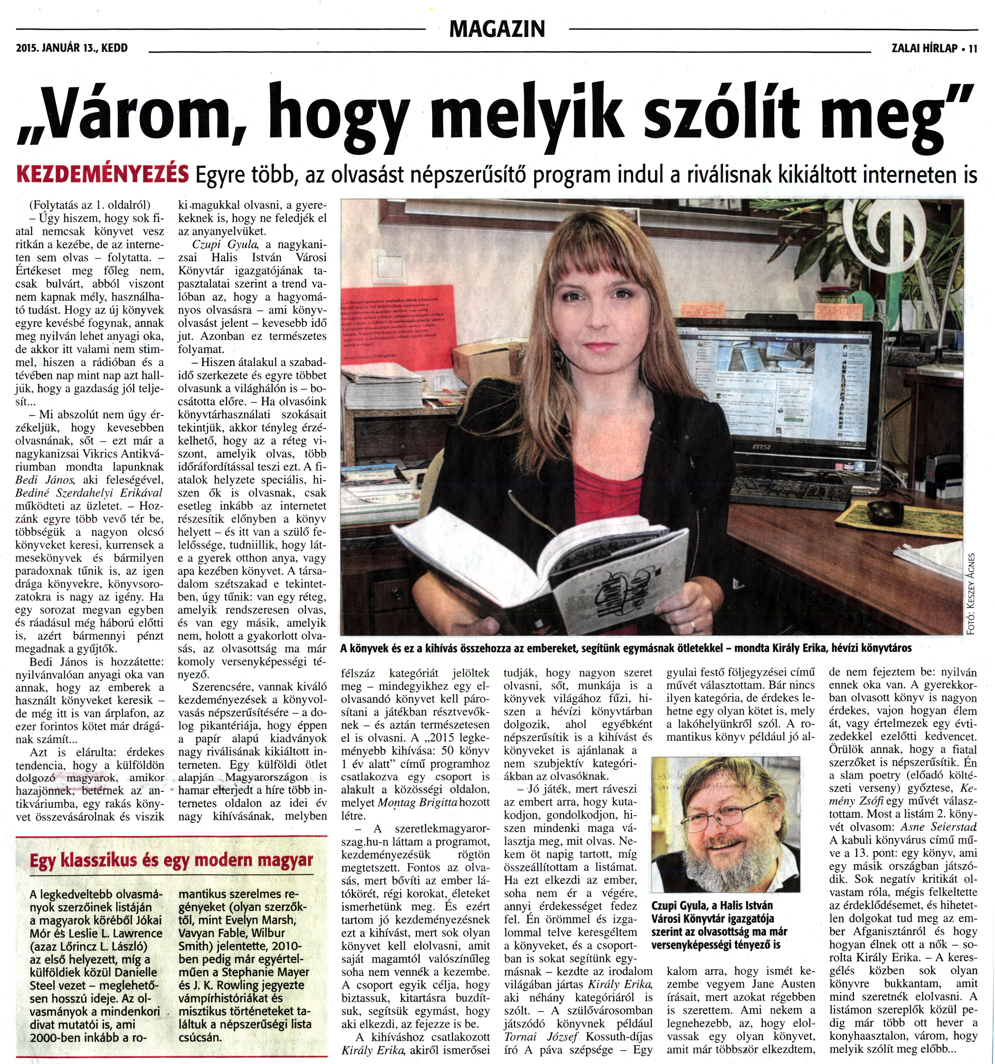 Nyilvános 2023 | 4390 | Zalai Hírlap 2015. január 13. 10. szám 11. oldal | 2015. JANUÁR 13., KEDD MAGAZIN ZALAI HÍRLAP • 11 „Várom, hogy melyik szólít meg" KEZDEMÉNYEZÉS Egyre több, az olvasást népszerűsítő program indul a riválisnak kikiáltott interneten is Egy klasszikus és egy modern magyar A legkedveltebb olvasmányok szerzőinek listáján a magyarok köréből Jókai Mór és Leslie L. Lawrence (azaz Lőrincz L. László) az első helyezett, míg a külföldiek közül Danielle Steel vezet - meglehetősen hosszú ideje. Az olvasmányok a mindenkori divat mutatói is, ami 2000-ben inkább a ro- mantikus szerelmes regényeket (olyan szerzőktől, mint Evelyn Marsh, Vavyan Fable, Wilbur Smith) jelentette, 2010-ben pedig már egyértelműen a Stephanie Mayer és J. K. Rowling jegyezte vámpírhistóriákat és misztikus történeteket találtuk a népszerűségi lista csúcsán. (Folytatás az 1. oldalról) - Úgy hiszem, hogy sok fiatal nemcsak könyvet vesz ritkán a kezébe, de az interneten sem olvas - folytatta. -Értékeset meg főleg nem, csak bulvárt, abból viszont nem kapnak mély, használható tudást. Hogy az új könyvek egyre kevésbé fogynak, annak meg nyilván lehet anyagi oka, de akkor itt valami nem stimmel, hiszen a rádióban és a tévében nap mint nap azt halljuk, hogy a gazdaság jól teljesít... - Mi abszolút nem úgy érzékeljük, hogy kevesebben olvasnának, sőt - ezt már a nagykanizsai Vikrics Antikváriumban mondta lapunknak Bedi János, aki feleségével, Bediné Szerdahelyi Erikával működteti az üzletet. - Hozzánk egyre több vevő tér be, többségük a nagyon olcsó könyveket keresi, kurrensek a mesekönyvek és bármilyen paradoxnak tűnik is, az igen drága könyvekre, könyvsorozatokra is nagy az igény. Ha egy sorozat megvan egyben és ráadásul még háború előtti is, azért bármennyi pénzt megadnak a gyűjtők. Bedi János is hozzátette: nyilvánvalóan anyagi oka van annak, hogy az emberek a használt könyveket keresik -de még itt is van árplafon, az ezer forintos kötet már drágának számít... Azt is elárulta: érdekes tendencia, hogy a külföldön dolgozó magyarok, amikor hazajönnek, betérnek az antikváriumba, egy rakás könyvet összevásárolnak és viszik ki magukkal olvasni, a gyerekeknek is, hogy ne feledjék el az anyanyelvüket. Czupi Gyula, a nagykanizsai Halis István Városi Könyvtár igazgátójának tapasztalatai szerint a trend valóban az, hogy a hagyományos olvasásra - ami könyvolvasást jelent - kevesebb idő jut. Azonban ez természetes folyamat. - Hiszen átalakul a szabadidő szerkezete és egyre többet olvasunk a világhálón is - bocsátotta előre. - Ha olvasóink könyvtárhasználati szokásait tekintjük, akkor tényleg érzékelhető, hogy az a réteg viszont, amelyik olvas, több időráfordítással teszi ezt. A fiatalok helyzete speciális, hiszen ők is olvasnak, csak esetleg inkább az internetet részesítik előnyben a könyv helyett - és itt van a szülő felelőssége, tudniillik, hogy lát-e a gyerek otthon anya, vagy apa kezében könyvet. A társadalom szétszakad e tekintetben, úgy tűnik: van egy réteg, amelyik rendszeresen olvas, és van egy másik, amelyik nem, holott a gyakorlott olvasás, az olvasottság ma már komoly versenyképességi tényező. Szerencsére, vannak kiváló kezdeményezések a könyvolvasás népszerűsítésére - a dolog pikantériája, hogy éppen a papír alapú kiadványok nagy riválisának kikiáltott interneten. Egy külföldi ötlet alapján Magyarországon is hamar elterjedt a híre több internetes oldalon az idei év nagy kihívásának, melyben félszáz kategóriát jelöltek meg - mindegyikhez egy elolvasandó könyvet kell párosítani a játékban résztvevőknek - és aztán természetesen el is olvasni. A „2015 legkeményebb kihívása: 50 könyv 1 év alatt" című programhoz csatlakozva egy csoport is alakult a közösségi oldalon, melyet Montag Brigitta hozott létre. - A szeretlekmagyarorszag.hu-n láttam a programot, kezdeményezésük rögtön megtetszett. Fontos az olvasás, mert bővíti az ember látókörét, régi korokat, életeket ismerhetünk meg. És ezért tartom jó kezdeményezésnek ezt a kihívást, mert sok olyan könyvet kell elolvasni, amit saját magamtól valószínűleg soha nem vennék a kezembe. A csoport egyik célja, hogy biztassuk, kitartásra buzdítsuk, segítsük egymást, hogy aki elkezdi, az fejezze is be. A kihíváshoz csatlakozott Király Erika, akiről ismerősei tudják, hogy nagyon szeret olvasni, sőt, munkája is a könyvek világához fűzi, hiszen a hévízi könyvtárban dolgozik, ahol egyébként népszerűsítik is a kihívást és könyveket is ajánlanak a nem szubjektív kategóriákban az olvasóknak. - Jó játék, mert ráveszi az embert arra, hogy kutakodjon, gondolkodjon, hiszen mindenki maga választja meg, mit olvas. Nekem öt napig tartott, míg összeállítottam a listámat. Ha ezt elkezdi az ember, soha nem ér a végére, annyi érdekességet fedez fel. Én örömmel és izgalommal telve keresgéltem a könyveket, és a csoportban is sokat segítünk egymásnak - kezdte az irodalom világában jártas Király Erika, aki néhány kategóriáról is szólt. - A szülővárosomban játszódó könyvnek például Tornai József Kossuth-díjas író A páva szépsége - Egy gyulai festő följegyzései című művét választottam. Bár nincs ilyen kategória, de érdekes lehetne egy olyan kötet is, mely a lakóhelyünkről szól. A romantikus könyv például jó al- kalom arra, hogy ismét kezembe vegyem Jane Austen írásait, mert azokat régebben is szerettem. Ami nekem a legnehezebb, az, hogy elolvassak egy olyan könyvet, amit már többször elkezdtem, de nem fejeztem be: nyilván ennek oka van. A gyerekkorban olvasott könyv is nagyon érdekes, vajon hogyan élem át, vagy értelmezek egy évtizedekkel ezelőtti kedvencet. Ö