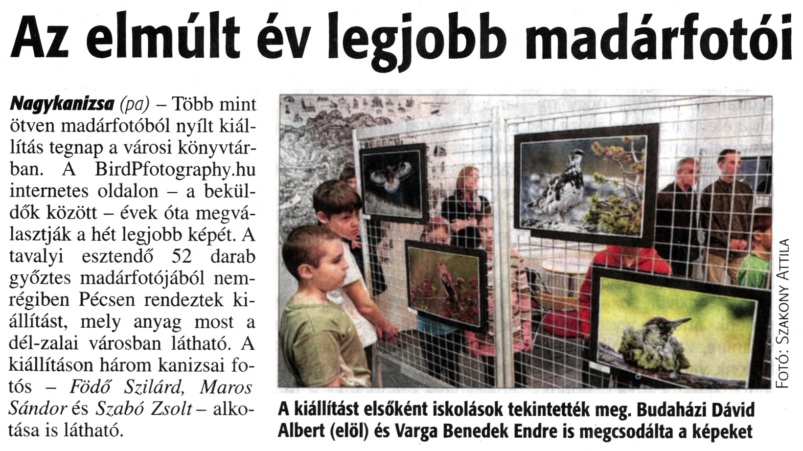 Nyilvános 1758 | 3389 | Zalai Hírlap 2015. március 10. 58. szám 3. oldal - Az elmúlt év legjobb madárfotói | Az elmúlt év legjobb madárfotói Nagykanizsa (pa) - Több mint ötven madárfotóból nyílt kiállítás tegnap a városi könyvtárban. A BirdPfotography.hu internetes oldalon - a beküldők között - évek óta megválasztják a hét legjobb képét. A tavalyi esztendő 52 darab győztes madárfotójából nemrégiben Pécsen rendeztek kiállítást, mely anyag most a dél-zalai városban látható. A kiállításon három kanizsai fotós - Födő Szilárd, Maros Sándor és Szabó Zsolt - alkotása is látható. A kiállítást elsőként iskolások tekintették meg. Budaházi Dávid Albert (elöl) és Varga Benedek Endre is megcsodálta a képeket |