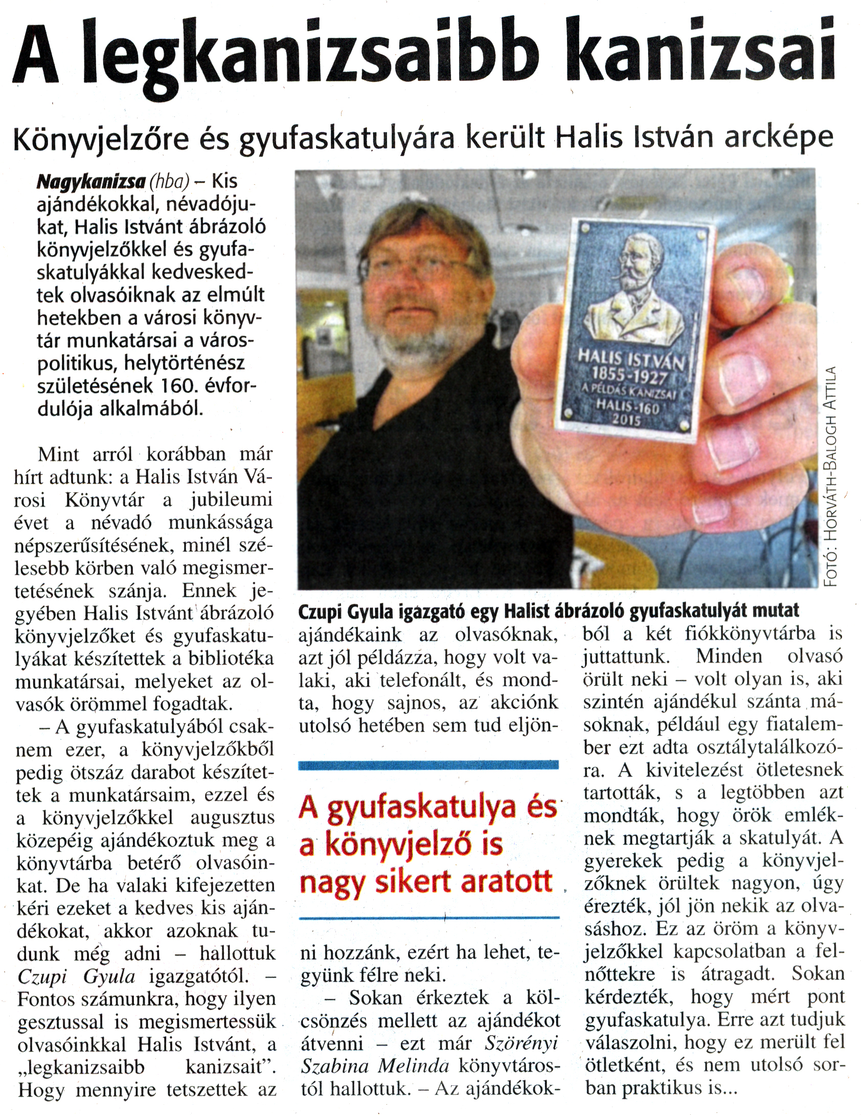 Nyilvános 1876 | 3649 | Zalai Hírlap 2015. szeptember 10. 212. szám 4. oldal | A legkanizsaibb kanizsai Könyvjelzőre és gyufaskatulyára került Halis István arcképe Czupi Gyula igazgató egy Halist ábrázoló gyufaskatulyát mutat A gyufaskatulya és a könyvjelző is nagy sikert aratott Nagykanizsa (hba) - Kis ajándékokkal, névadójukat, Halis Istvánt ábrázoló könyvjelzőkkel és gyufaskatulyákkal kedveskedtek olvasóiknak az elmúlt hetekben a városi könyvtár munkatársai a várospolitikus, helytörténész születésének 160. évfordulója alkalmából. Mint arról korábban már hírt adtunk: a Halis István Városi Könyvtár a jubileumi évet a névadó munkássága népszerűsítésének, minél szélesebb körben való megismertetésének szánja. Ennek jegyében Halis Istvánt ábrázoló könyvjelzőket és gyufaskatulyákat készítettek a bibliotéka munkatársai, melyeket az olvasók örömmel fogadtak. - A gyufaskatulyából csaknem ezer, a könyvjelzőkből pedig ötszáz darabot készítettek a munkatársaim, ezzel és a könyvjelzőkkel augusztus közepéig ajándékoztuk meg a könyvtárba betérő olvasóinkat. De ha valaki kifejezetten kéri ezeket a kedves kis ajándékokat, akkor azoknak tudunk még adni - hallottuk Czupi Gyula igazgatótól. -Fontos számunkra, hogy ilyen gesztussal is megismertessük olvasóinkkal Halis Istvánt, a „legkanizsaibb kanizsait". Hogy mennyire tetszettek az ajándékaink az olvasóknak, azt jól példázza, hogy volt valaki, aki telefonált, és mondta, hogy sajnos, az akciónk utolsó hetében sem tud eljönni hozzánk, ezért ha lehet, tegyünk félre neki. - Sokan érkeztek a kölcsönzés mellett az ajándékot átvenni - ezt már Szörényi Szabina Melinda könyvtárostól hallottuk. - Az ajándékok- ból a két fiókkönyvtárba is juttattunk. Minden olvasó Örült neki - volt olyan is, aki szintén ajándékul szánta másoknak, például egy fiatalember ezt adta osztálytalálkozóra. A kivitelezést ötletesnek tartották, s a legtöbben azt mondták, hogy örök emléknek megtartják a skatulyát. A gyerekek pedig a könyvjelzőknek örültek nagyon, úgy érezték, jól jön nekik az olvasáshoz. Ez az öröm a könyvjelzőkkel kapcsolatban a felnőttekre is átragadt. Sokan kérdezték, hogy mért pont gyufaskatulya. Erre azt tudjuk válaszolni, hogy ez merült fel ötletként, és nem utolsó sorban praktikus is... |