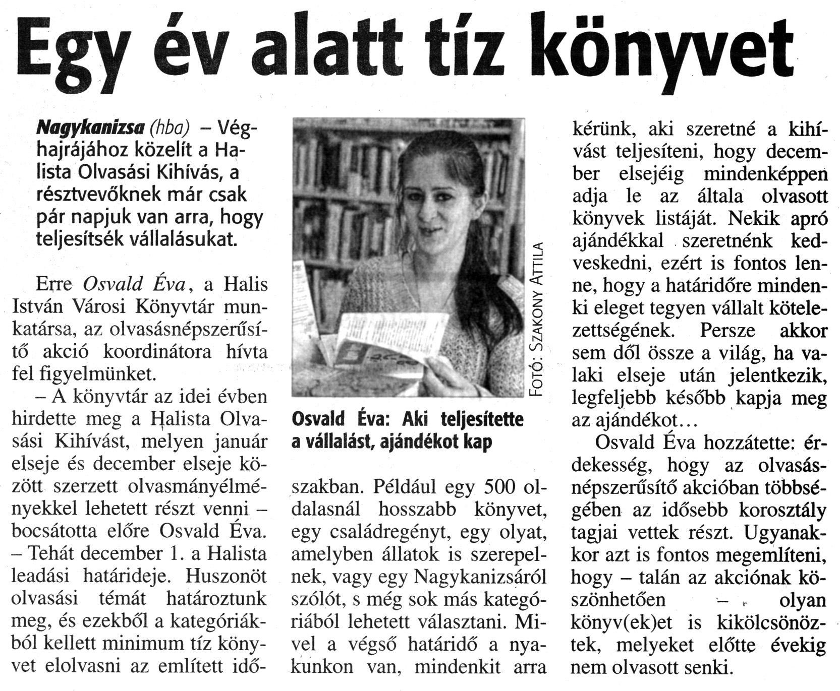 Nyilvános 2094 | 3718 | Zalai Hírlap 2015. november 26. 277. szám 7. oldal | Egy év alatt tíz könyvet Nagykanizsa (hba) - Véghajrájához közelít a Ha-lista Olvasási Kihívás, a résztvevőknek már csak pár napjuk van arra, hogy teljesítsék vállalásukat. Erre Osvald Éva, a Halis István Városi Könyvtár munkatársa, az olvasásnépszerűsítő akció koordinátora hívta fel figyelmünket. - A könyvtár az idei évben hirdette meg a Halista Olvasási Kihívást, melyen január elseje és december elseje között szerzett olvasmányélményekkel lehetett részt venni -bocsátotta előre Osvald Éva. - Tehát december 1. a Halista leadási határideje. Huszonöt olvasási témát határoztunk meg, és ezekből a kategóriákból kellett minimum tíz könyvet elolvasni az említett időszakban. Például egy 500 oldalasnál hosszabb könyvet, egy családregényt, egy olyat, amelyben állatok is szerepelnek, vagy egy Nagykanizsáról szólót, s még sok más kategóriából lehetett választani. Mivel a végső határidő a nyakunkon van, mindenkit arra kérünk, aki szeretné a kihívást teljesíteni, hogy december elsejéig mindenképpen adja le az általa olvasott könyvek listáját. Nekik apró ajándékkal szeretnénk kedveskedni, ezért is fontos lenne, hogy a határidőre mindenki eleget tegyen vállalt kötelezettségének. Persze akkor sem dől össze a világ, ha valaki elseje után jelentkezik, legfeljebb később kapja meg az ajándékot... Osvald Éva hozzátette: érdekesség, hogy az olvasás-népszerűsítő akcióban többségében az idősebb korosztály tagjai vettek részt. Ugyanakkor azt is fontos megemlíteni, hogy - talán az akciónak köszönhetően - olyan könyv(ek)et is kikölcsönöztek, melyeket előtte évekig nem olvasott senki. Osvald Éva: Aki teljesítette a vállalást, ajándékot kap |